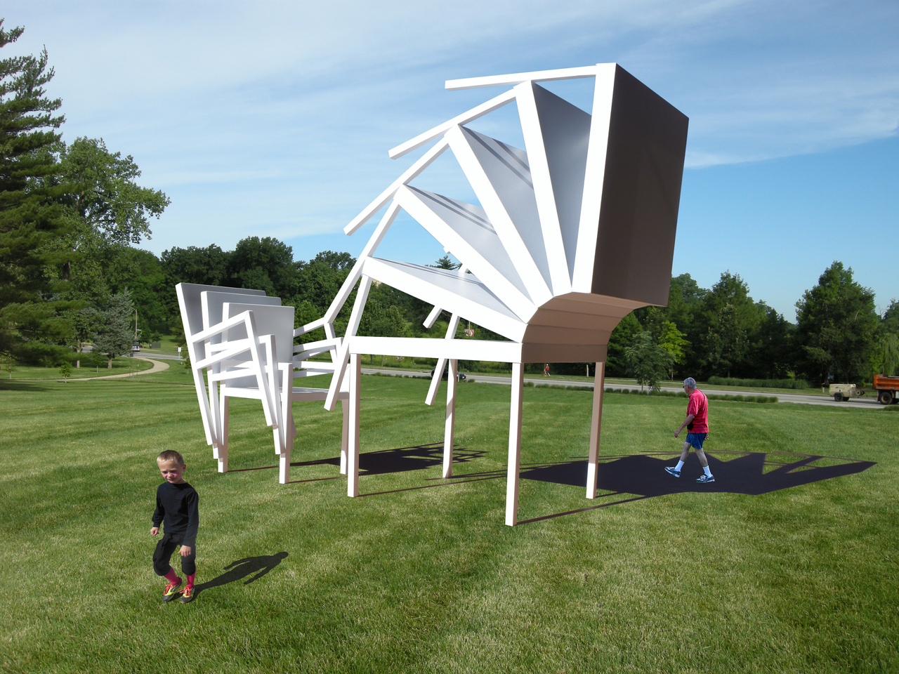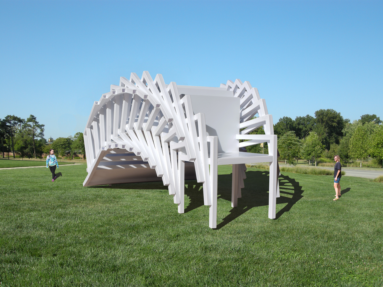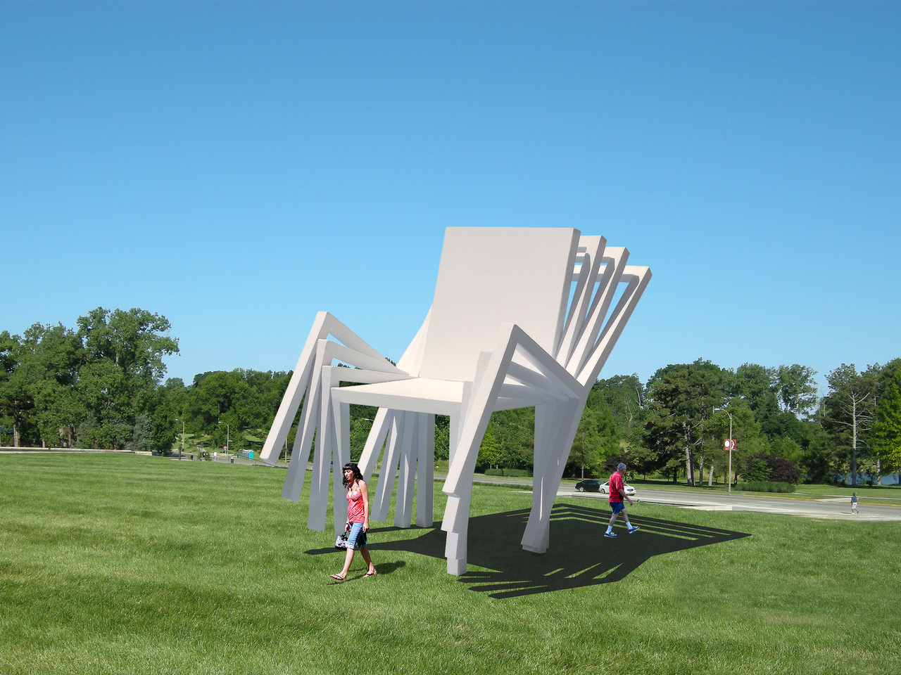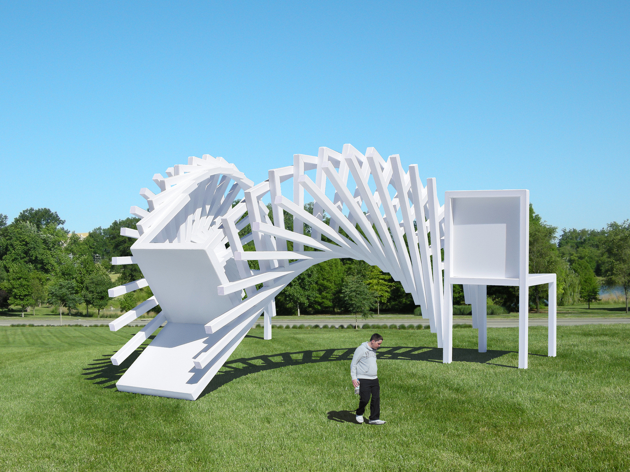 « Monumental Moving Furniture » va plus loin en investissant le domaine architectural. Construit en acier peint, cette série consiste en des formes abstraites de chaises et de tables. Chacune est générée par le mouvement de l’objet original à travers l’espace et le temps, verrouillant son chemin en une chaîne de segments connectés. À cette échelle, ce qui était initialement un simple objet du quotidien prend des proportions quasi architecturales.
