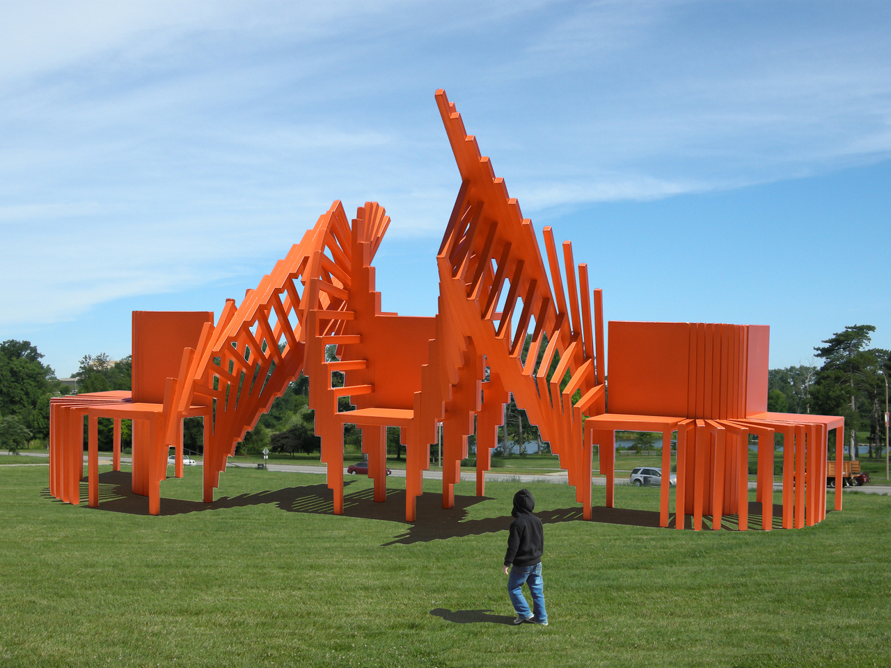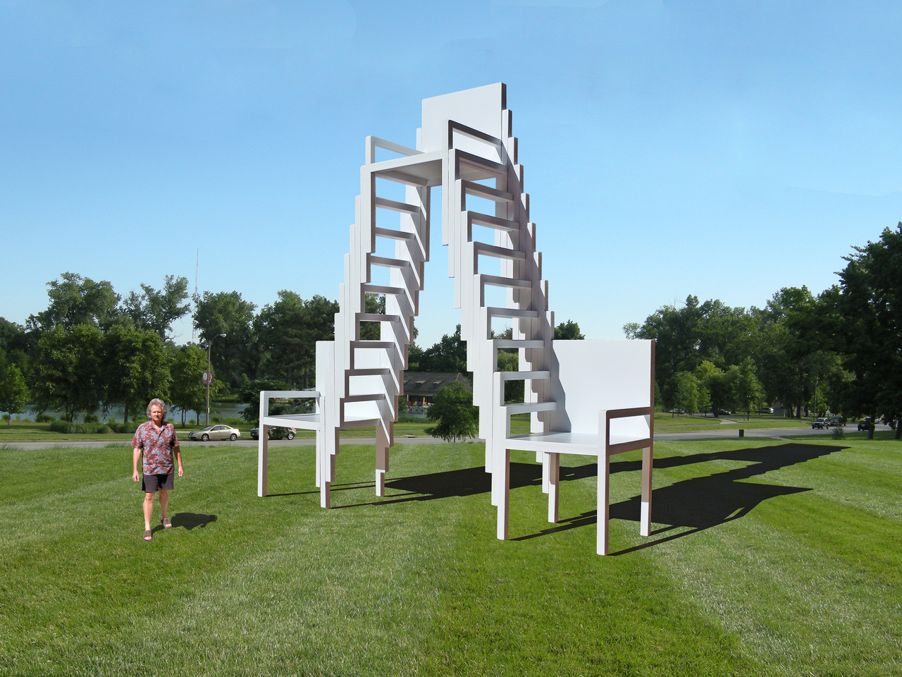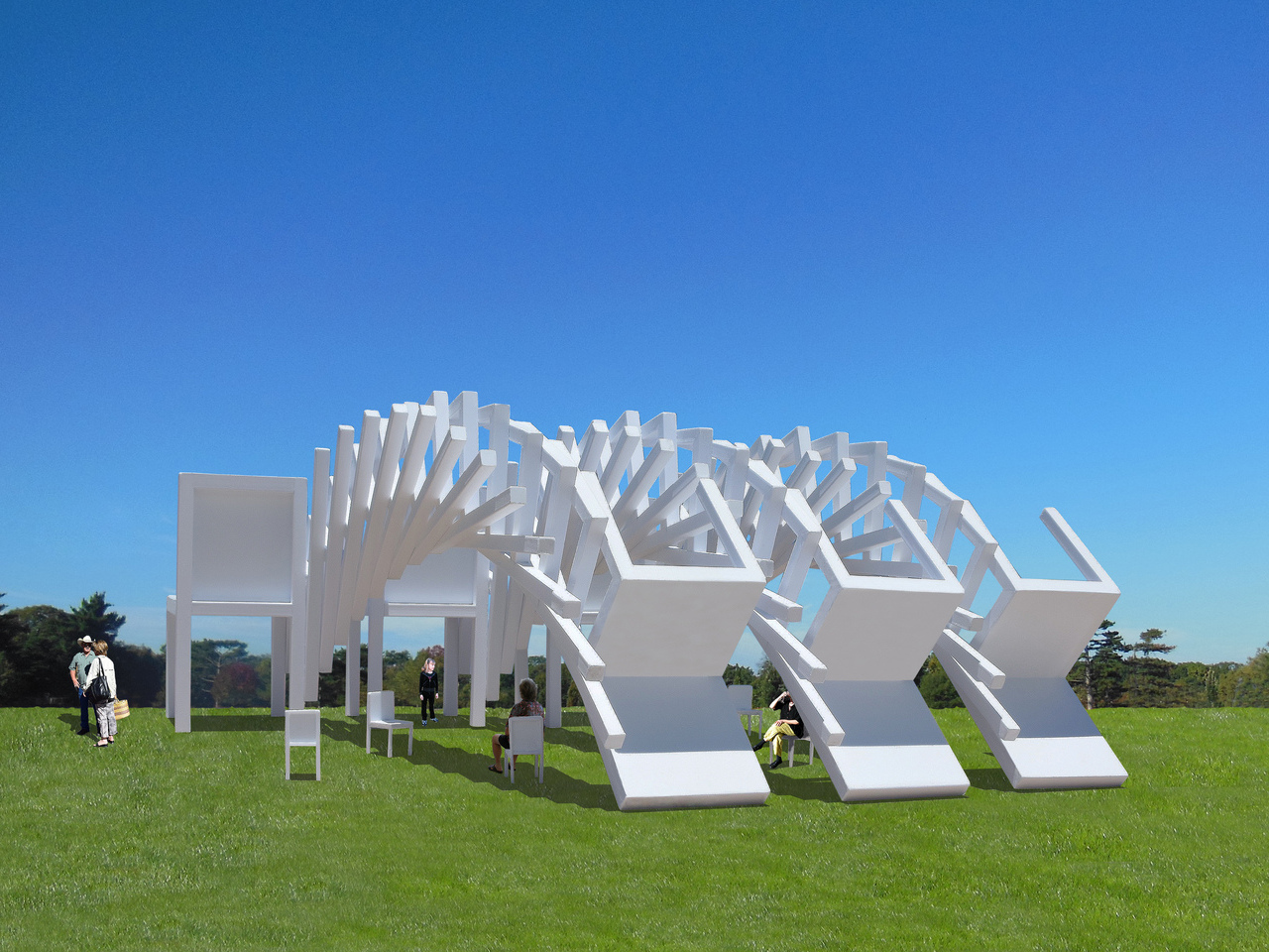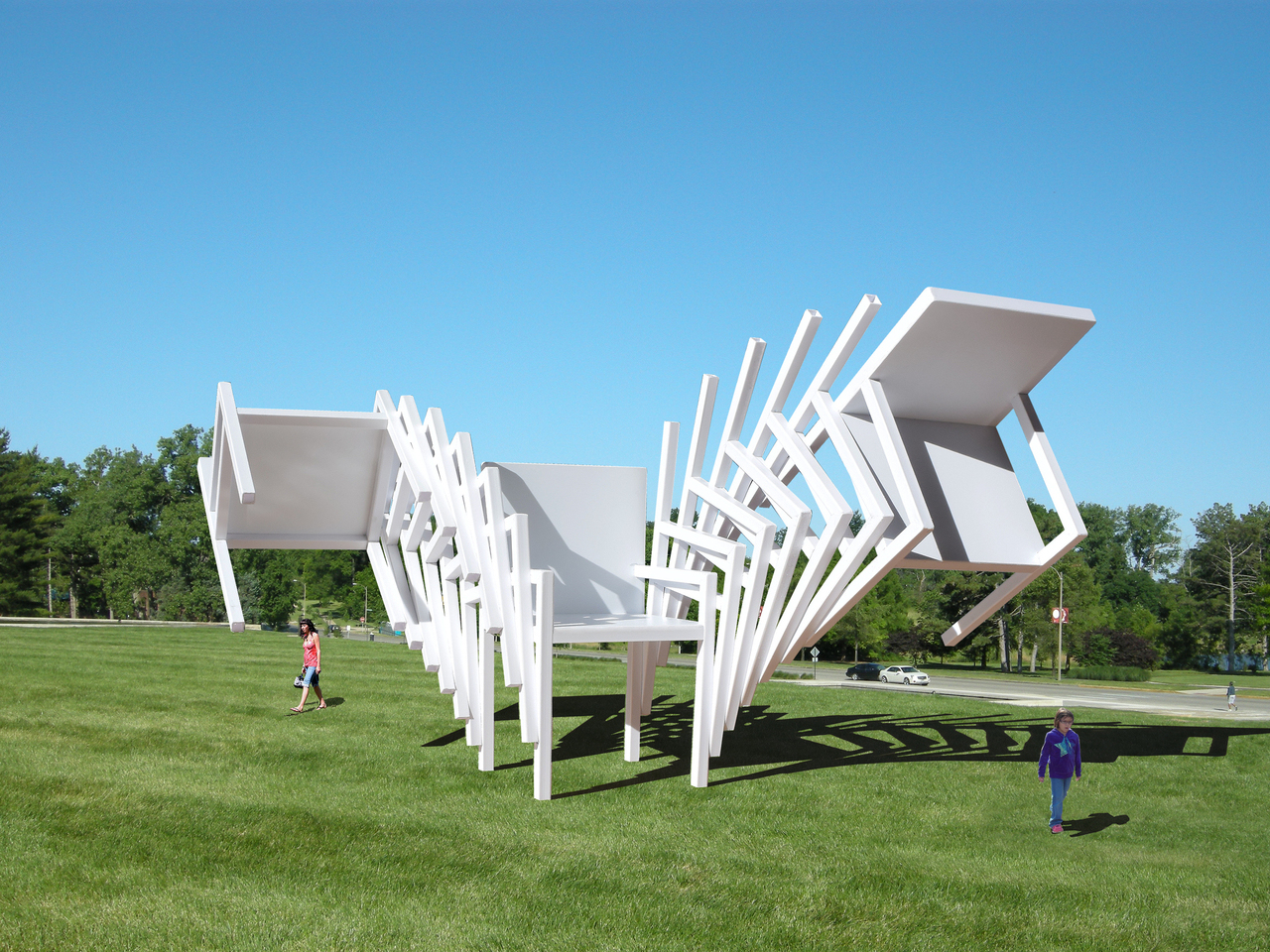 « Monumental Moving Furniture » va plus loin en investissant le domaine architectural. Construit en acier peint, cette série consiste en des formes abstraites de chaises et de tables. Chacune est générée par le mouvement de l’objet original à travers l’espace et le temps, verrouillant son chemin en une chaîne de segments connectés. À cette échelle, ce qui était initialement un simple objet du quotidien prend des proportions quasi architecturales.