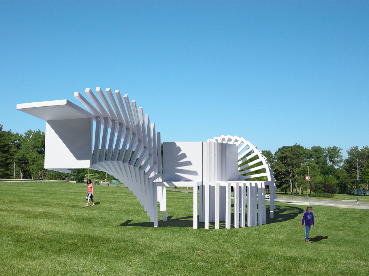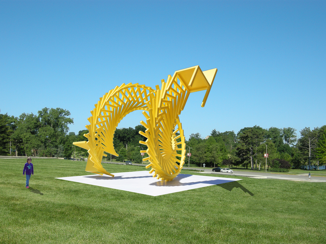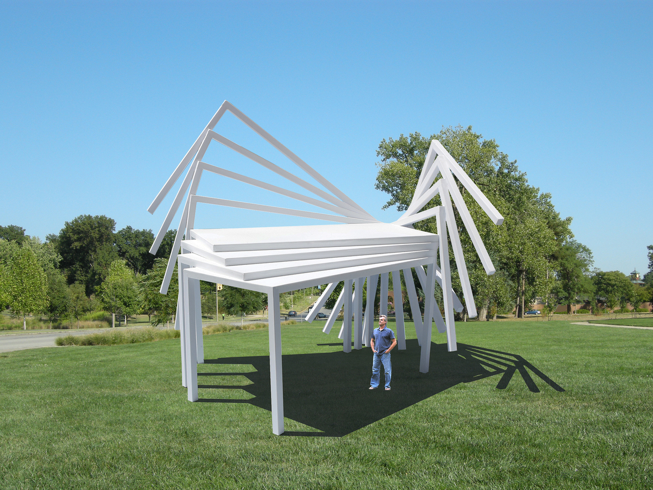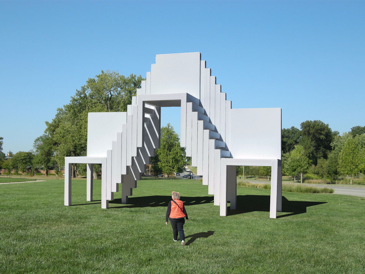 « Monumental Moving Furniture » va plus loin en investissant le domaine architectural. Construit en acier peint, cette série consiste en des formes abstraites de chaises et de tables. Chacune est générée par le mouvement de l’objet original à travers l’espace et le temps, verrouillant son chemin en une chaîne de segments connectés. À cette échelle, ce qui était initialement un simple objet du quotidien prend des proportions quasi architecturales.