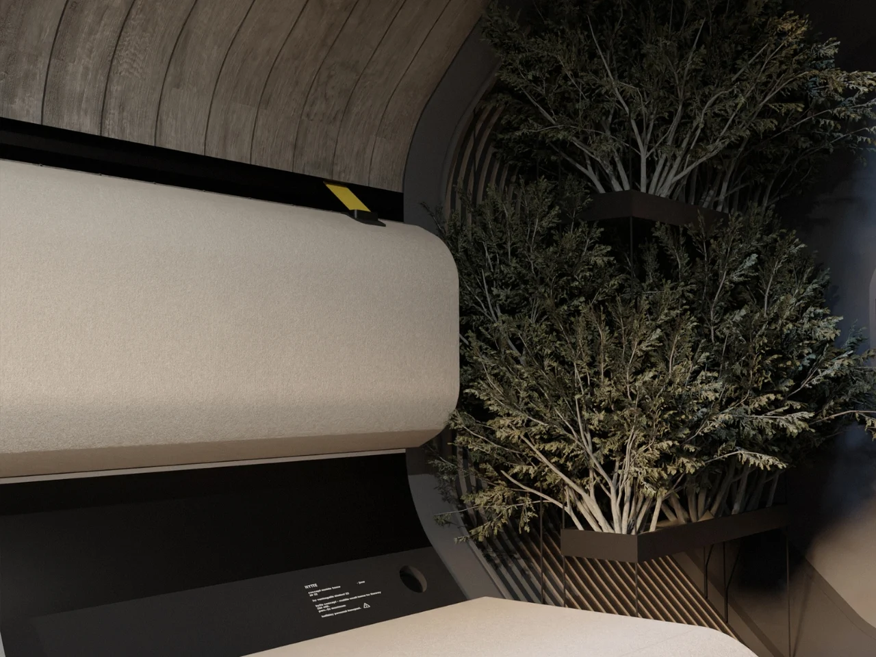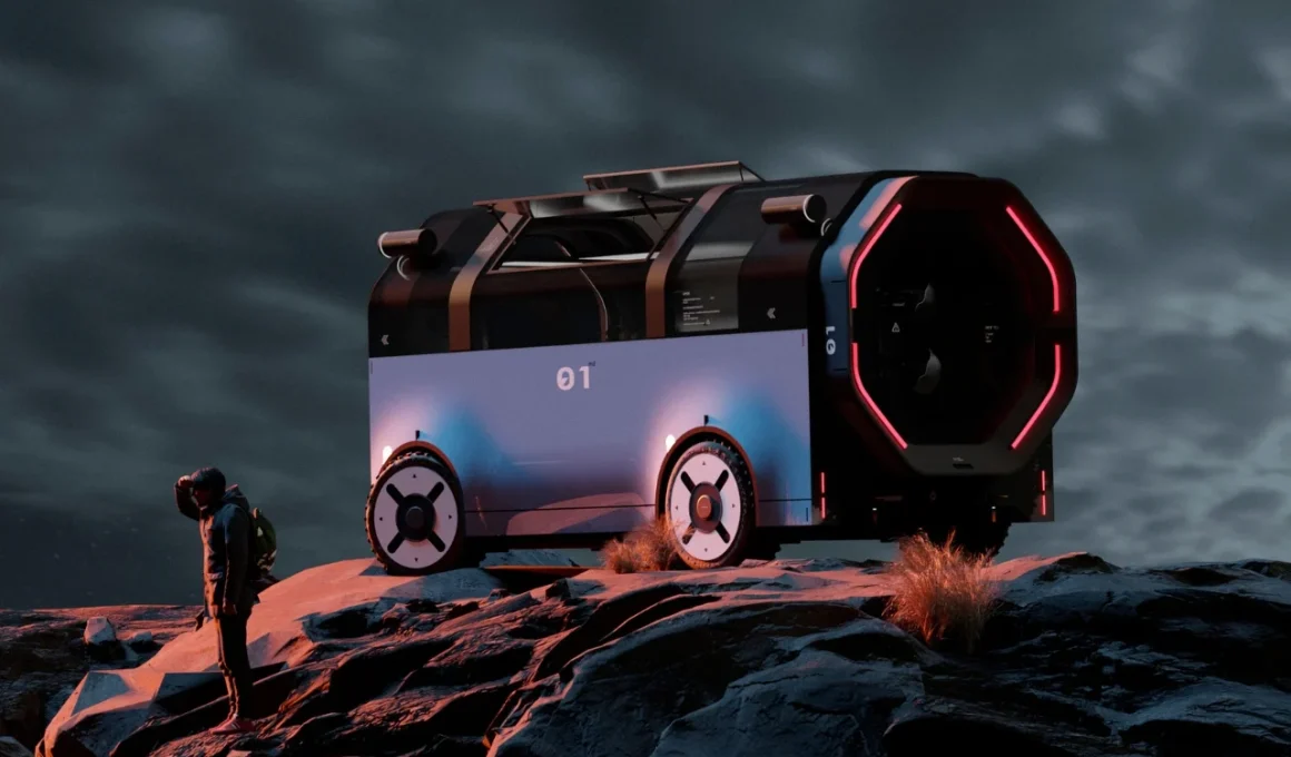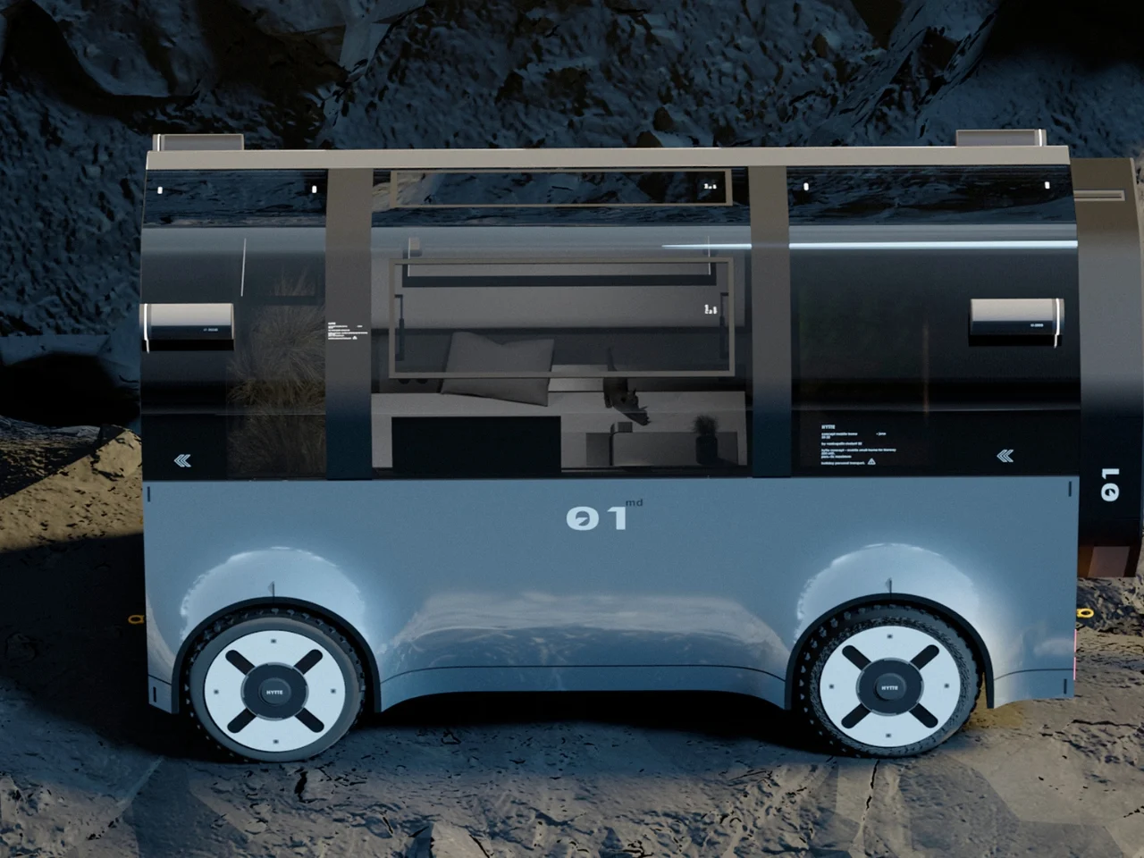 De l’extérieur, HYTTE ne ressemble en rien aux mobil-homes que l’on voit sur nos routes. Sa silhouette est compacte et arrondie, avec une finition en ton mat foncé et un visage octogonal qui lui confère une qualité presque architecturale. L’anneau en LED rouge qui encadre ce visage constitue un élément de dynamisme dans un design globalement sobre, mais c’est précisément cette harmonie qui crée une impression de sophistication. Vu de côté, les proportions évoquent davantage une architecture paysagère qu’un véhicule, ce qui correspond exactement à l’intention de RE:BURO.