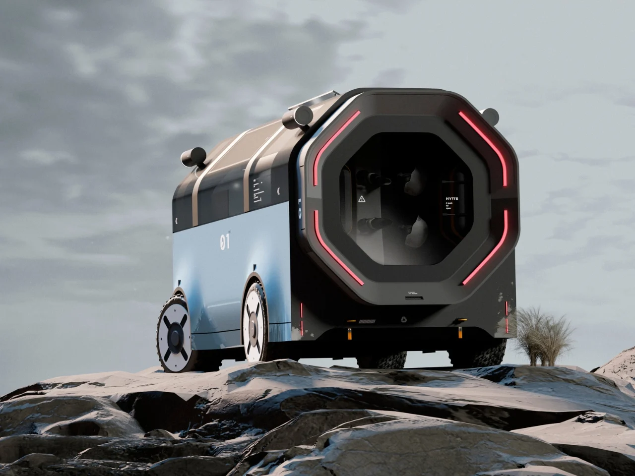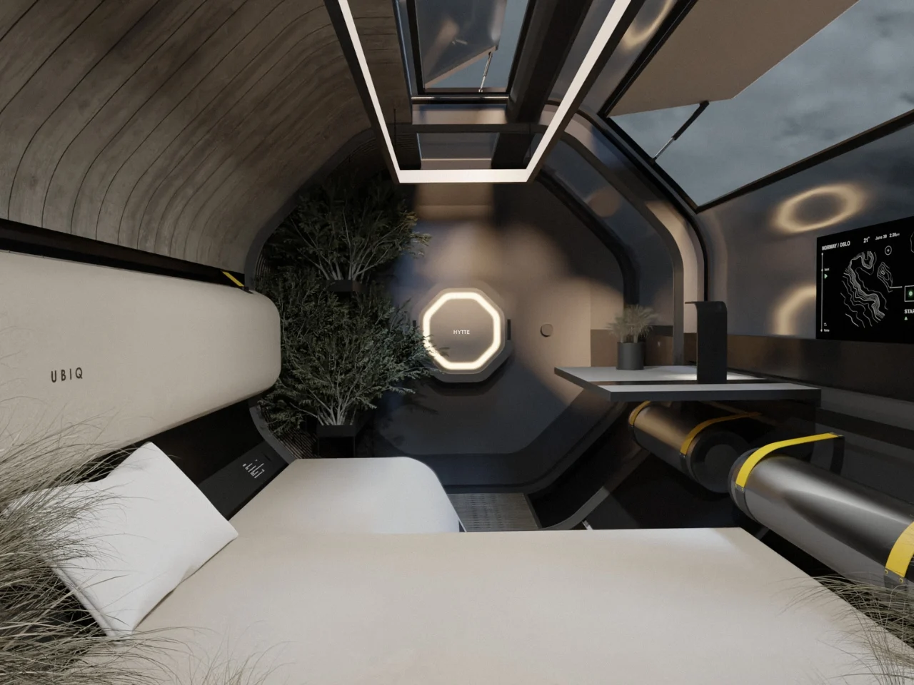 La plateforme structurelle est l’un des aspects les plus inventifs du concept. Le châssis utilise deux grippeurs en forme de pince, similaires aux pinces d’un crabe, qui maintiennent le compartiment de vie des deux côtés grâce à des câbles et à des fixations. Cette logique modulaire signifie que la plateforme n’est pas figée dans une seule configuration. Elle peut être adaptée à différents scénarios d’utilisation, faisant de HYTTE un système polyvalent plutôt qu’un véhicule à usage unique.