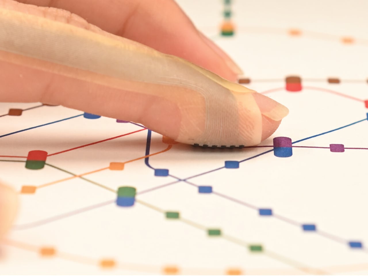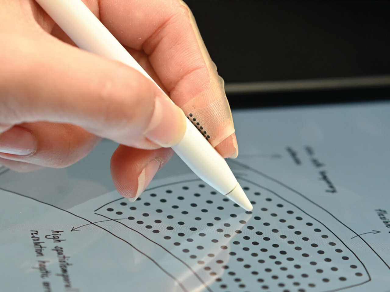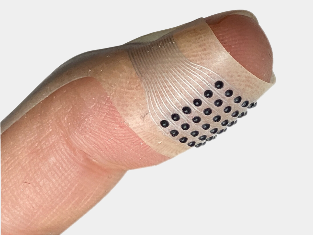 VoxeLite est un patch transparent et extensible qui s’enroule autour de votre doigt comme une mince bande adhésive. Ne mesurant que un dixième de millimètre d’épaisseur et pesant moins qu’un trombone, il dissimule une grille de minuscules dômes souples, chacun pouvant être activé ou désactivé individuellement. Lorsque vous faites glisser votre doigt sur une surface, ces dômes génèrent des motifs de force qui évoquent des bosses, des ondulations ou des indications directionnelles superposées à tout ce que vous touchez.