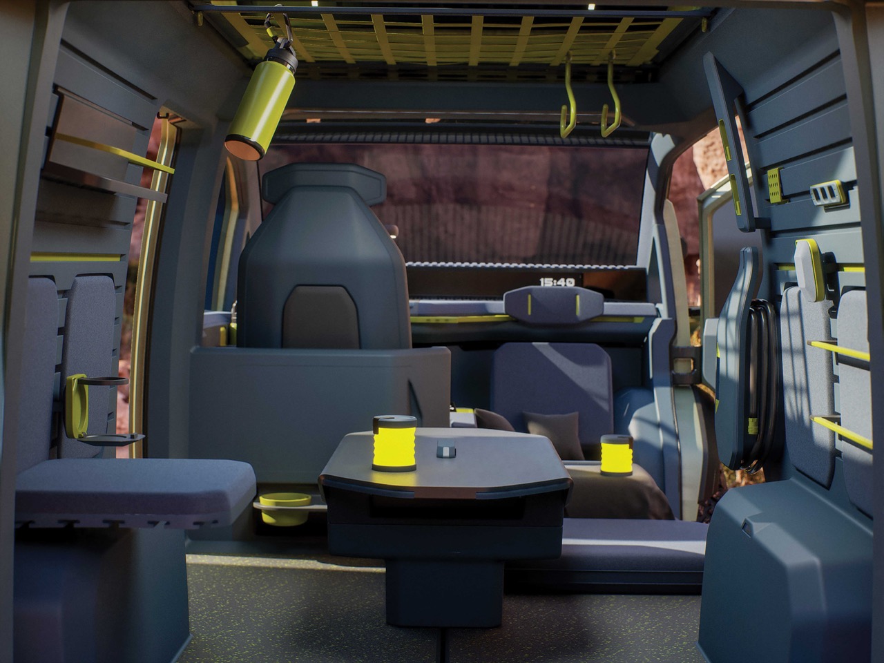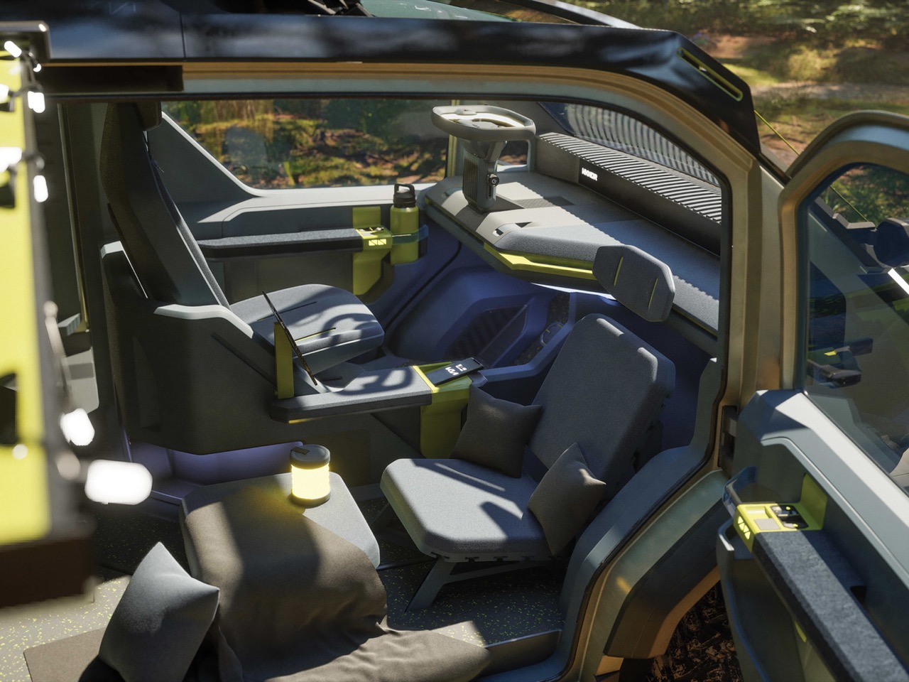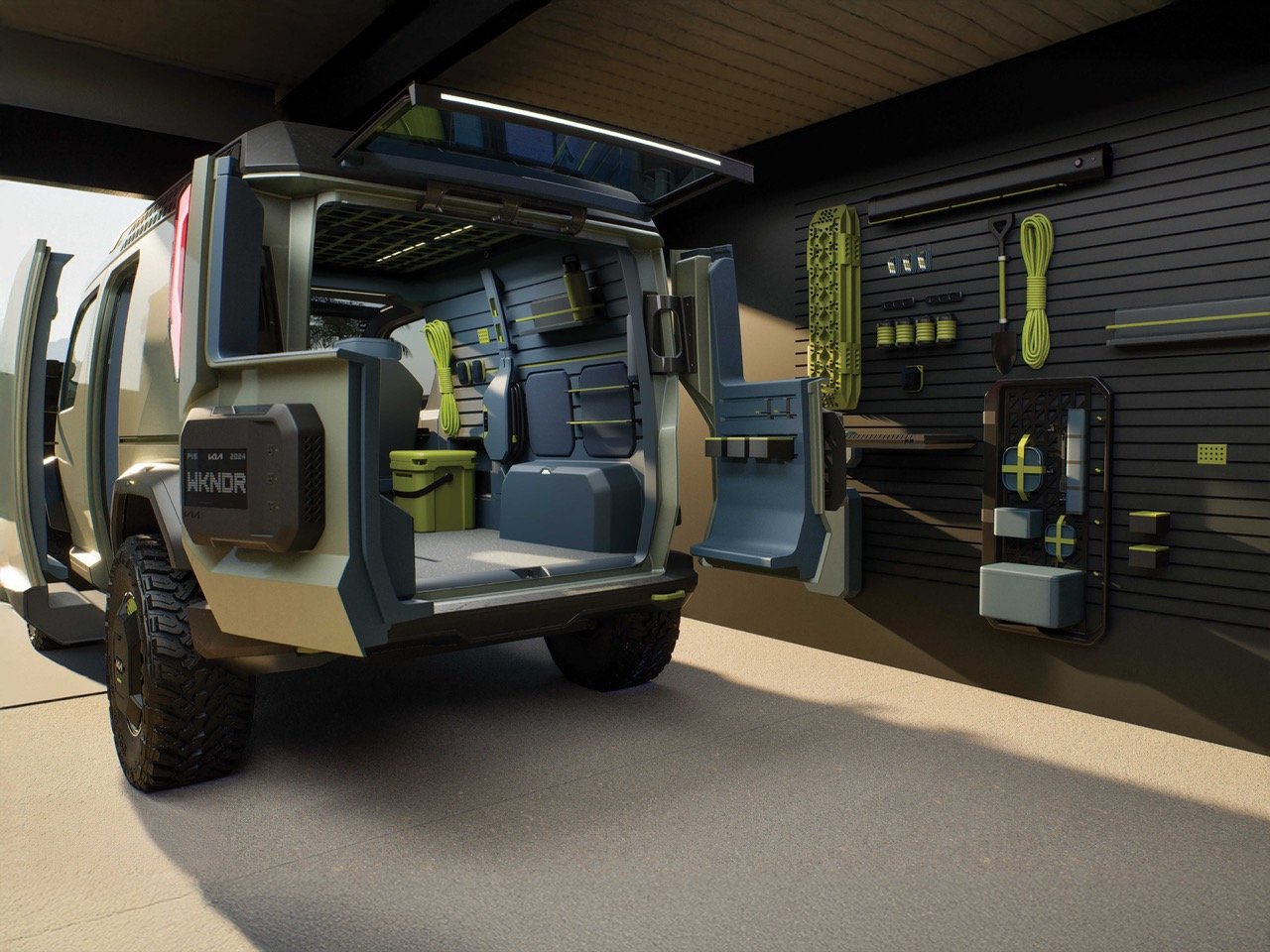 En entrant dans le WKNDR, on ressent un mélange entre un petit appartement haut de gamme et un espace de travail modulaire. Le système de rails permet aux utilisateurs de reconfigurer l’intérieur en quelques minutes, passant d’un espace de couchage à une salle à manger ou à un hub de stockage. Les matériaux, à la fois durables et raffinés, sont accompagnés d’une palette de couleurs apaisante et énergisante. Les designers de Kia ont clairement pensé à des cas d’utilisation concrets, non pas uniquement à des photos pour un kit de presse. Même le plafond est exploité pour le rangement, et l’ajout d’un compresseur embarqué pour gonfler des pneus ou du matériel gonflable est le type de détail qui distingue un design réfléchi d’un concept inachevé.