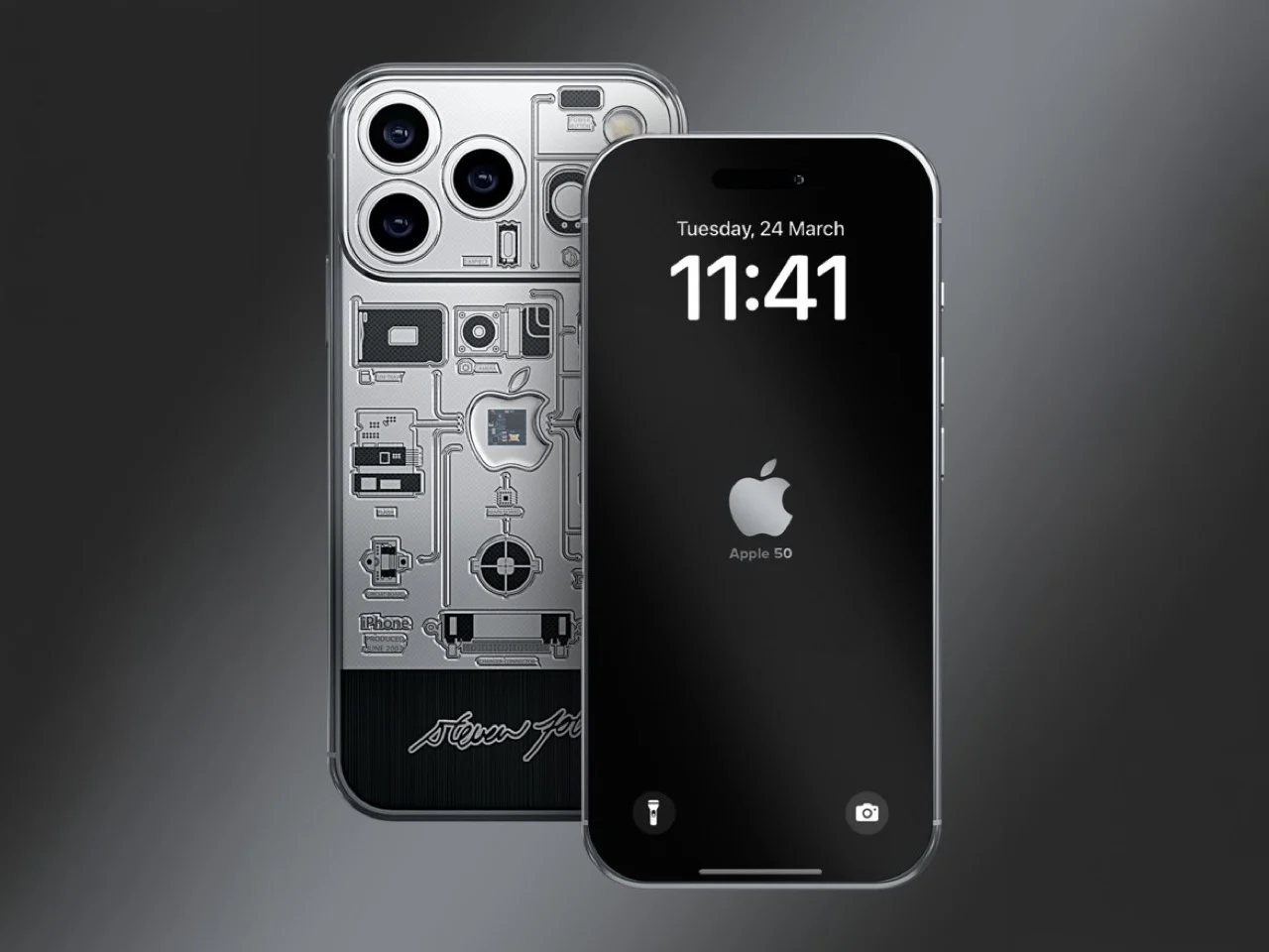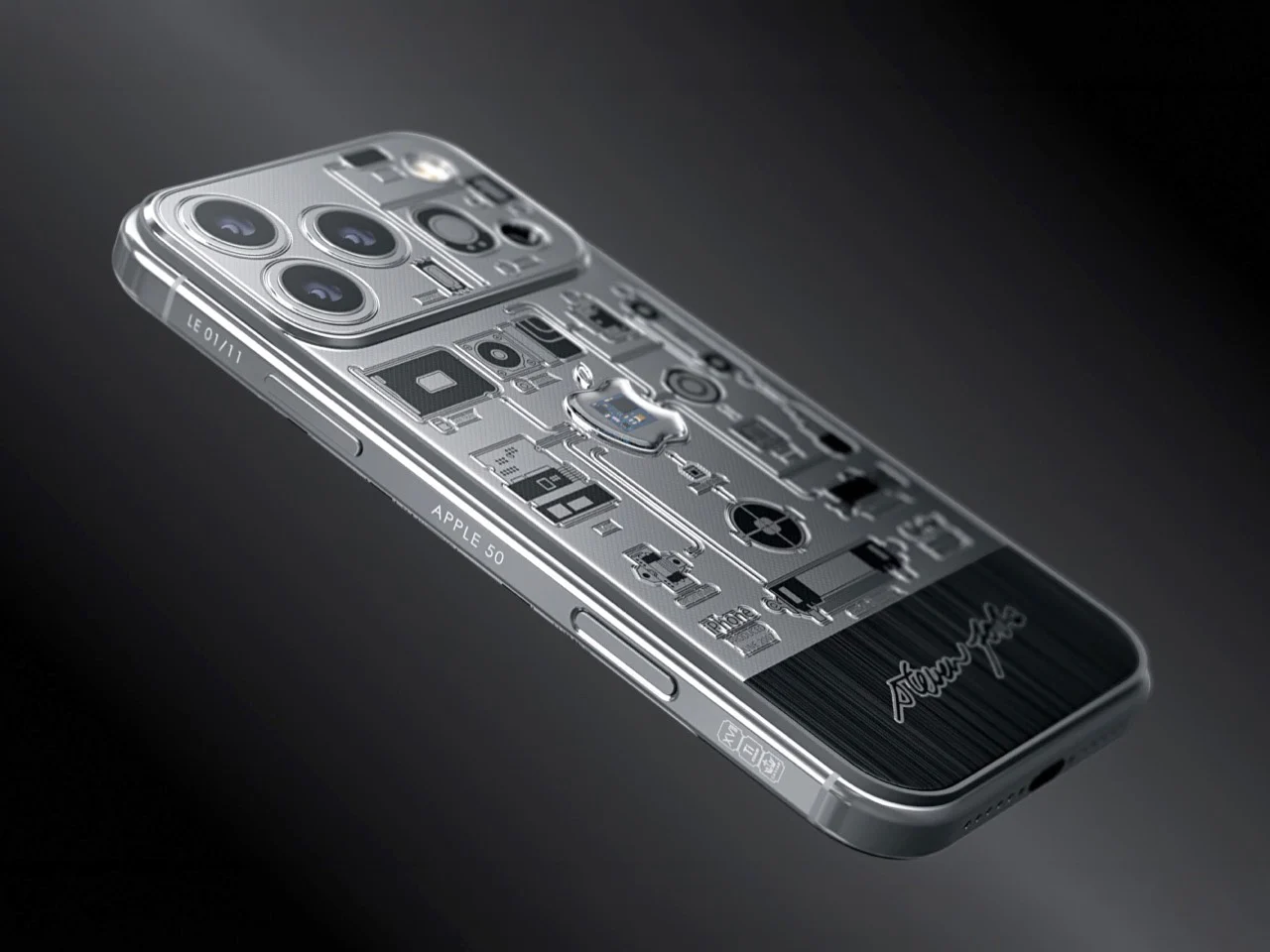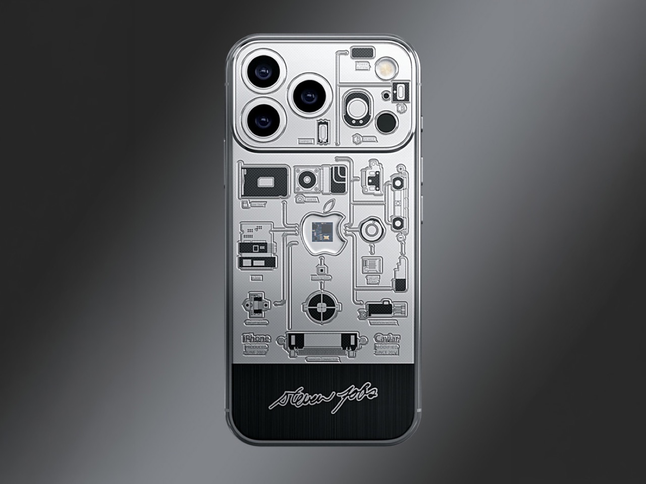 Le châssis de ce modèle est en titane, revêtu d’un PVD noir. L’association des couleurs choisies est intentionnelle : noir et argent. La position décalée du logo ainsi que l’engravure minimaliste sont autant de clins d’œil au modèle original de 2007, sans pour autant le copier. L’approche de Caviar se distingue par cette sagesse, offrant une interprétation audacieuse du design classique. Le fragment de la carte mère est positionné au centre du panneau arrière, tandis que les gravures des circuits s’étendent autour de lui, rappelant un schéma technique inachevé. La signature de Jobs figure le long du cadre, transformant ce smartphone en une véritable œuvre d’art qui condense une chronologie, intégrant des technologies de 2007 dans celles de 2025, le tout séparé par quelques millimètres de titane usiné.