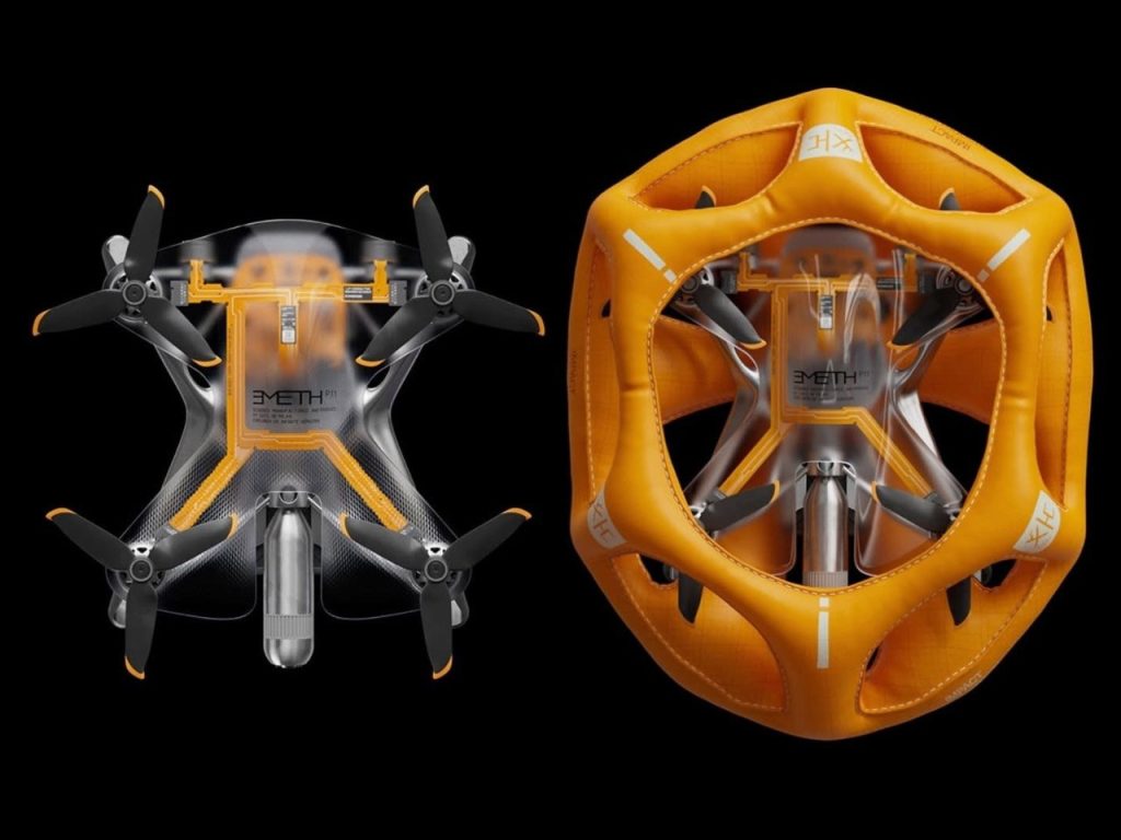 Le drone Emeth, conçu par Design House de SAES, est axé sur la sécurité et est destiné à fonctionner dans des terrains difficiles et inconnus. Il intègre des avancées en matière de science des matériaux et se distingue par son système d’airbag innovant qui se déploie en cas de chute.
