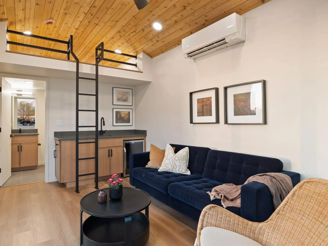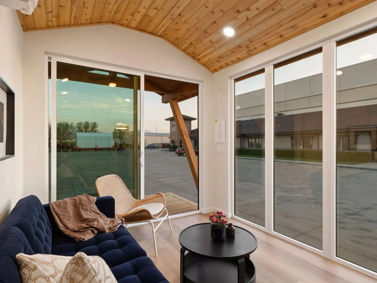 Le design intérieur est un mélange équilibré entre fonctionnalité et esthétique. Les murs en bois créent une ambiance chaleureuse et accueillante. La lumière naturelle, véhiculée par les grandes fenêtres, renforce cette atmosphère conviviale. De plus, le plafond voûté ajoute une dimension spatiale qui est souvent cherchée dans des conceptions plus grandes, mais qui ici, est réalisée avec brio.