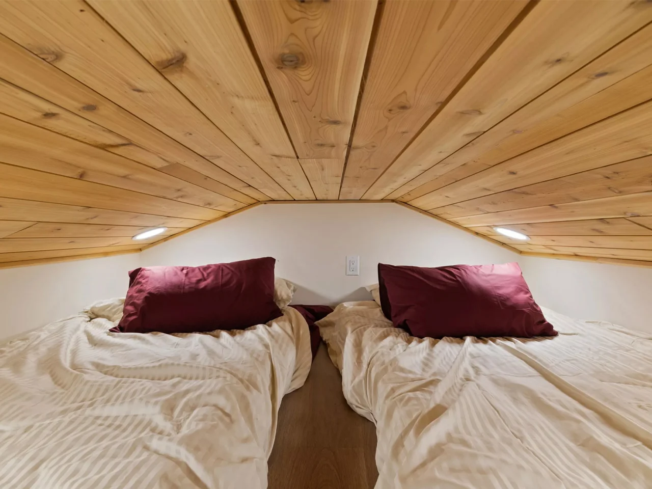 Avec des dimensions de 3 mètres de large sur 6 mètres de long, ce modèle réussi à intégrer un espace de chambre en mezzanine, une salle de bain optionnelle, une cuisine en gallerie, ainsi qu’une zone de vie et de loisirs, le tout dans un espace de vie de 18,58 mètres carrés. Sur le papier, cela pourrait paraître exigu, mais la réalité est bien différente. De grandes fenêtres inondent l’intérieur de lumière naturelle, tandis que les murs en bois chaud créent une atmosphère chaleureuse. Le plafond voûté permet de donner une sensation d’espace, surprenant pour une cabine de cette taille.