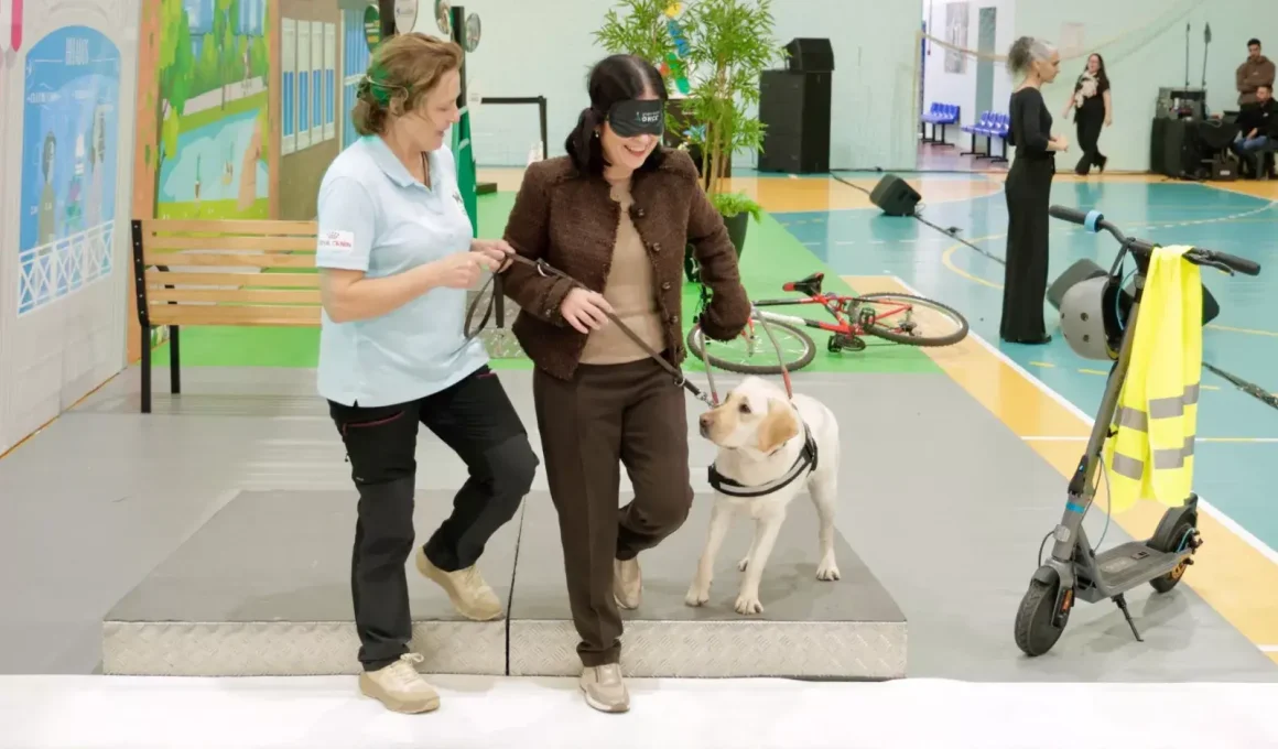 Lors d’une des démonstrations, la maire a parcouru le circuit avec un masque sur les yeux, guidée par l’un des chiens, lui permettant de ressentir directement comment se déplacer en faisant confiance uniquement au travail de l’animal, soulignant ainsi l’importance de ces chiens pour la mobilité et la sécurité des personnes ayant une déficience visuelle.