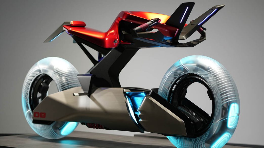 La couleur de la moto a un effet de superposition qui crée un sentiment de dynamisme lorsqu’elle prend des virages ou navigue dans les rues de Tokyo dans un futur proche. L’écran avant du vélo est placé sur le côté, en forme de V, plutôt qu’à l’avant. Les écrans holographiques seront monnaie courante à cette époque, de sorte que le vélo ne présentera aucun angle mort dans la vision périphérique et affichera toutes les données télémétriques vitales dans le champ de vision. Les roues semblent également être fabriquées à l’aide d’une technologie avancée qui est transparente et ne laisse aucune trace de caoutchouc.