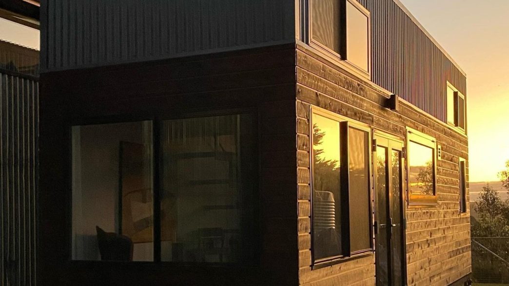 Le salon est ponctué de portes coulissantes en verre et d’une baie vitrée surdimensionnée que l’on retrouve dans la plupart des tiny houses australiennes. La maison laisse entrer la lumière naturelle tout au long de la journée, créant ainsi un espace de vie lumineux et accueillant. La maison est une construction mystérieuse et séduisante, spécialement conçue et construite pour les résidents.