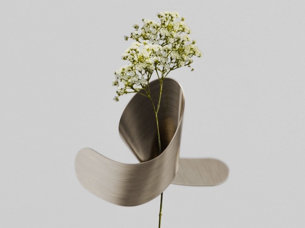 Le vase en laiton est également unique par sa forme, qui ne comporte aucun réceptacle pour contenir non seulement les fleurs, mais aussi l’eau. Au lieu de cela, la bande de métal est courbée et pliée pour créer une forme inhabituelle, presque comme un nœud traditionnel figé dans le temps. Cette forme est capable de tenir seule sur une surface plane sans aucun support, et les tiges des plantes peuvent s’insérer dans la boucle au centre.