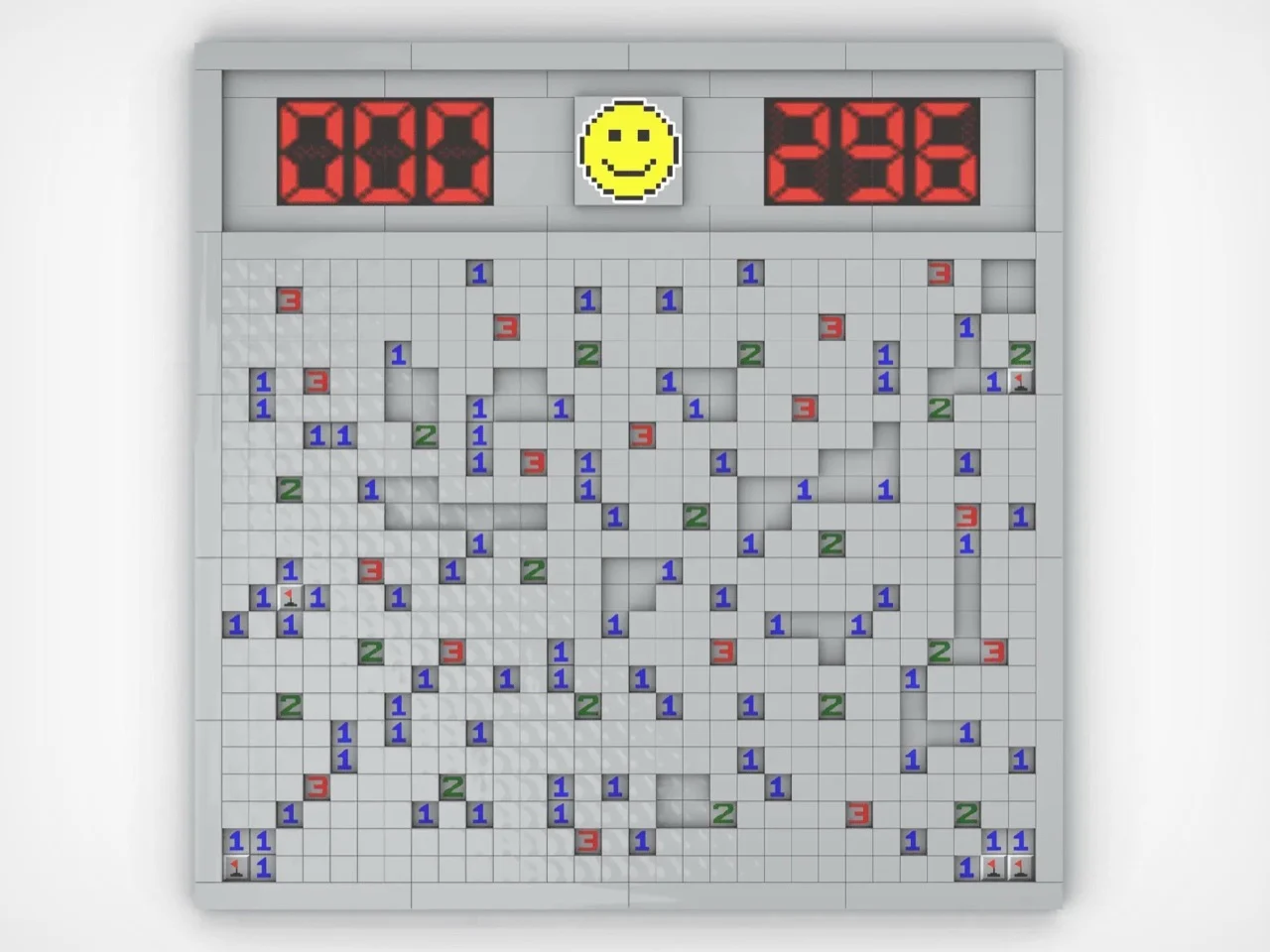 La grille utilise des tuiles texturées LEGO pour distinguer les carrés couverts (ces gris inconnus, pleins de tension) des tuiles révélées avec les indices numériques. Les chiffres sont représentés par des tuiles imprimées ou des autocollants, rendant hommage à cette police digitale chunky qui définissait les premiers graphismes informatiques. En haut, les affichages numériques montrent à la fois le compteur de mines et le chronomètre, utilisant des configurations classiques à sept segments. Chaque seconde qui passe vous rappelle la pression de deviner quel carré est sûr et qui pourrait se transformer en explosion pixelisée.