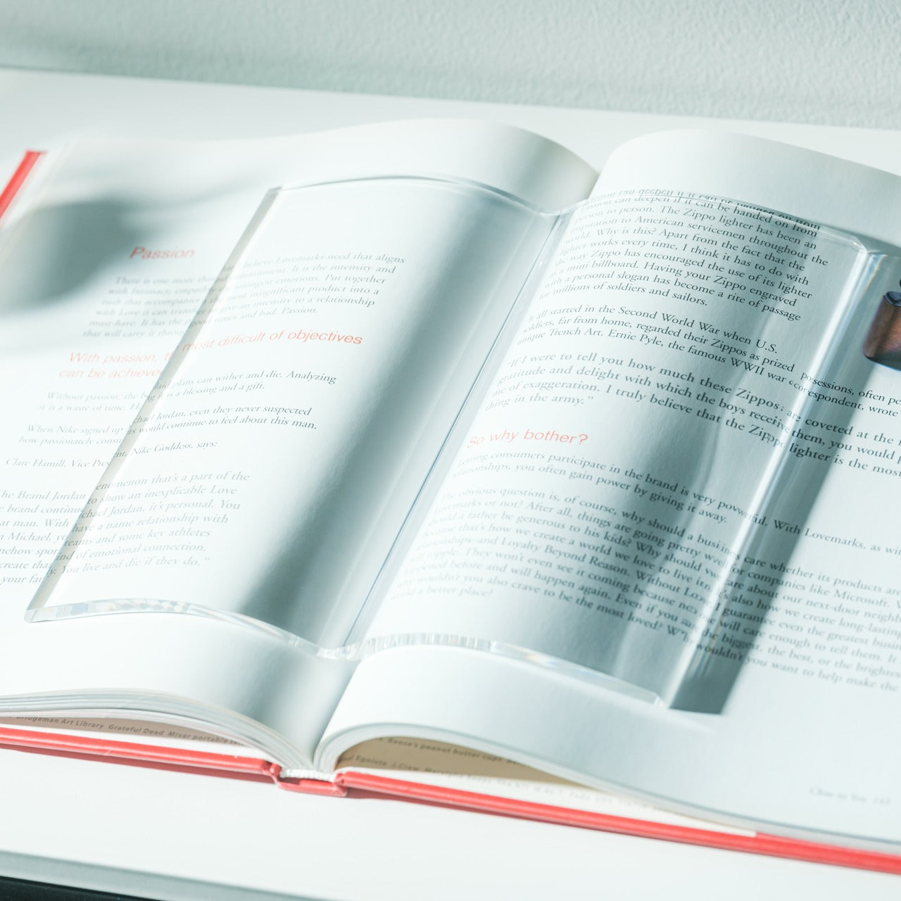 Le marque-page Bookish résout un problème courant avec élégance : maintenir les pages ouvertes sans fatiguer les mains. Fabriqué en résine acrylique transparente, il permet de lire les mains libres tout en protégeant les pages des taches ou des plis accidentels.