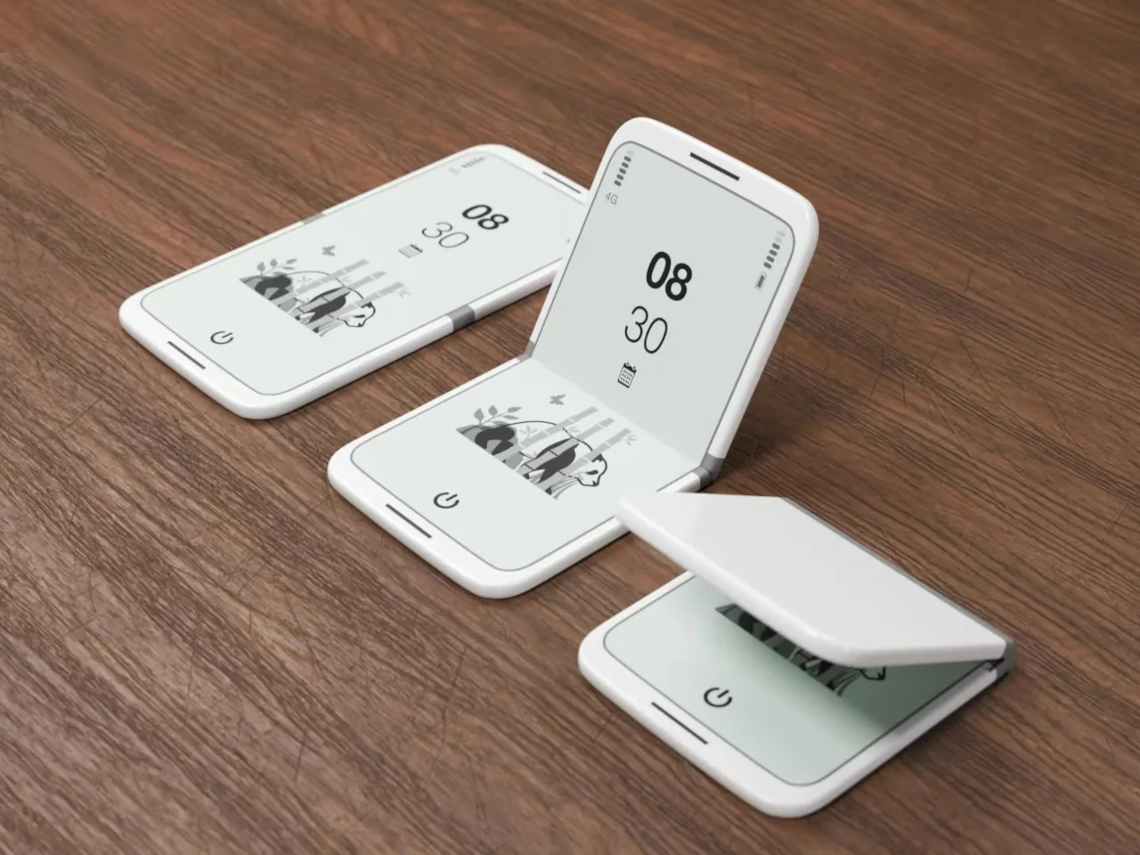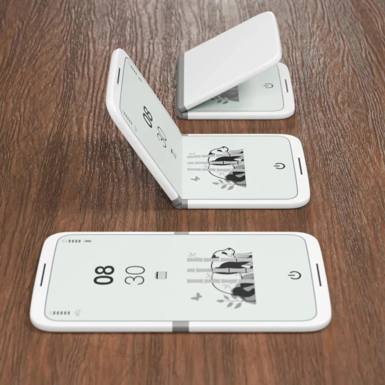 Le tinyBook Flip est un concept de téléphone pliable basé sur un écran E Ink de 6,1 pouces. Fermé, il se plie en une forme presque carrée avec une finition blanche mate et des coins arrondis, davantage en proportion avec une carte de vœux pliée qu’un smartphone. Lorsque le téléphone est fermé, l’écran disparaît complètement. Plus de rectangle lumineux face vers le haut sur le bureau, plus de rappel ambiant qu’il reste des choses à vérifier. Juste un petit objet silencieux qui « ne fait rien ».