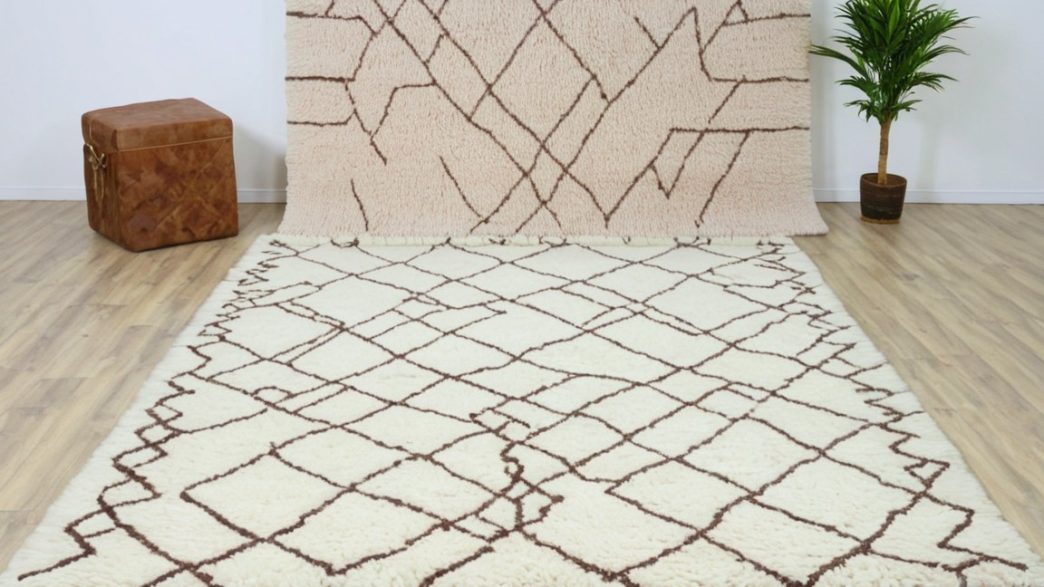 Fabriqués principalement à partir de laine de mouton, ces tapis se déclinent en plusieurs styles selon leur région d’origine. Parmi les plus célèbres, on retrouve le Beni Ouarain, avec son fond écru et ses motifs noirs minimalistes, et le Azilal, plus coloré et audacieux. D’autres, comme le Boucherouite, sont confectionnés avec des tissus recyclés, offrant une explosion de couleurs et de textures. Grâce à leur qualité et leur résistance, ces tapis en laine traversent les générations tout en conservant leur beauté naturelle.