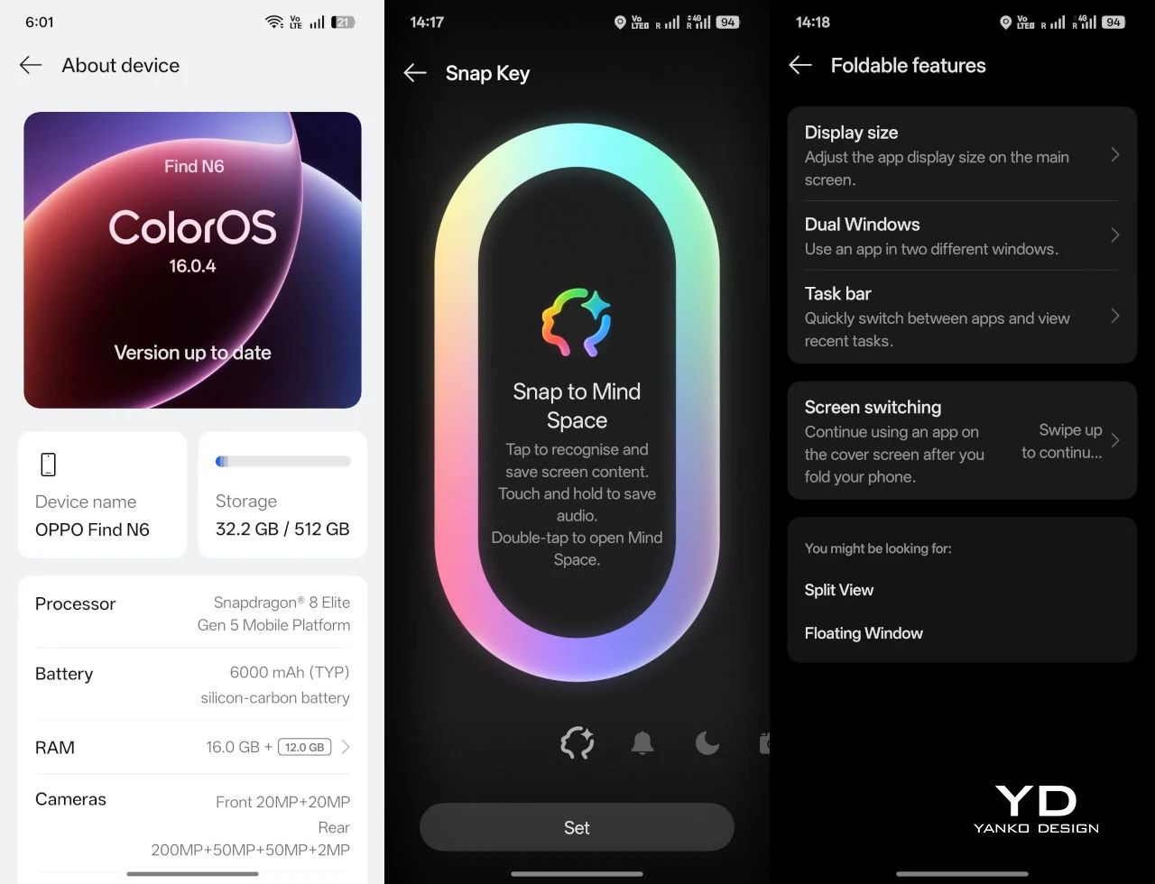 Propulsé par le Snapdragon 8 Elite de Qualcomm, le Find N6 gère aisément les tâches multitâches. Les applications s’ouvrent rapidement, et même avec plusieurs fenêtres ouvertes, le téléphone reste fluide et réactif. Les fonctionnalités que le système écrit autour de cet espace d’écran aident à enrichir l’expérience utilisateur.