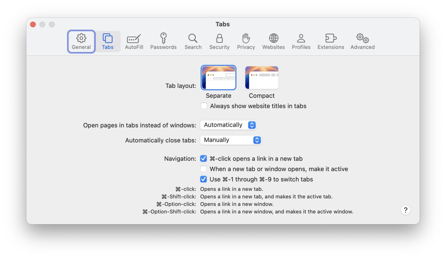 Chaque conception d’onglets comporte ses propres avantages. La disposition traditionnelle peut être préférable pour les utilisateurs qui ouvrent simultanément un grand nombre d’onglets; chaque onglet restant clairement visible avec le titre de la page. D’un autre côté, la disposition compacte convient mieux aux utilisateurs qui privilégient l’espace de visualisation de contenu au détriment de la lisibilité des titres d’onglets.