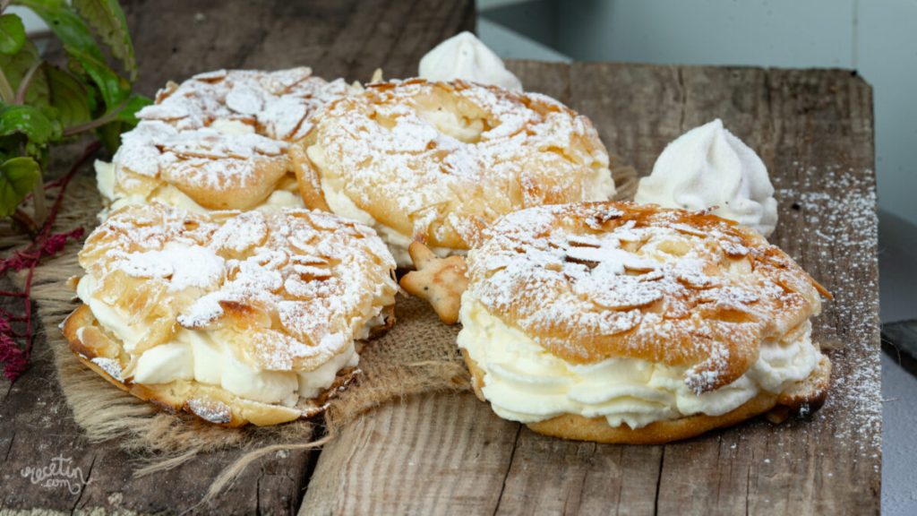 Les ingrédients principaux de ces pasteles sont la pâte choux, les œufs, le sucre, la farine, le lait, le beurre, l’eau, les amandes et la crème fouettée (nata).