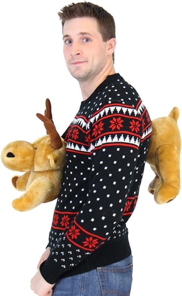 Le pull de Noël avec une peluche de T-Rex a été élu meilleur pull de tous les temps. C’est un pull unique en son genre qui plaira à tous les fans de dinosaure. Et si vous n’aimez pas les dinosaures vous avez la version Renne du Père-Noël :