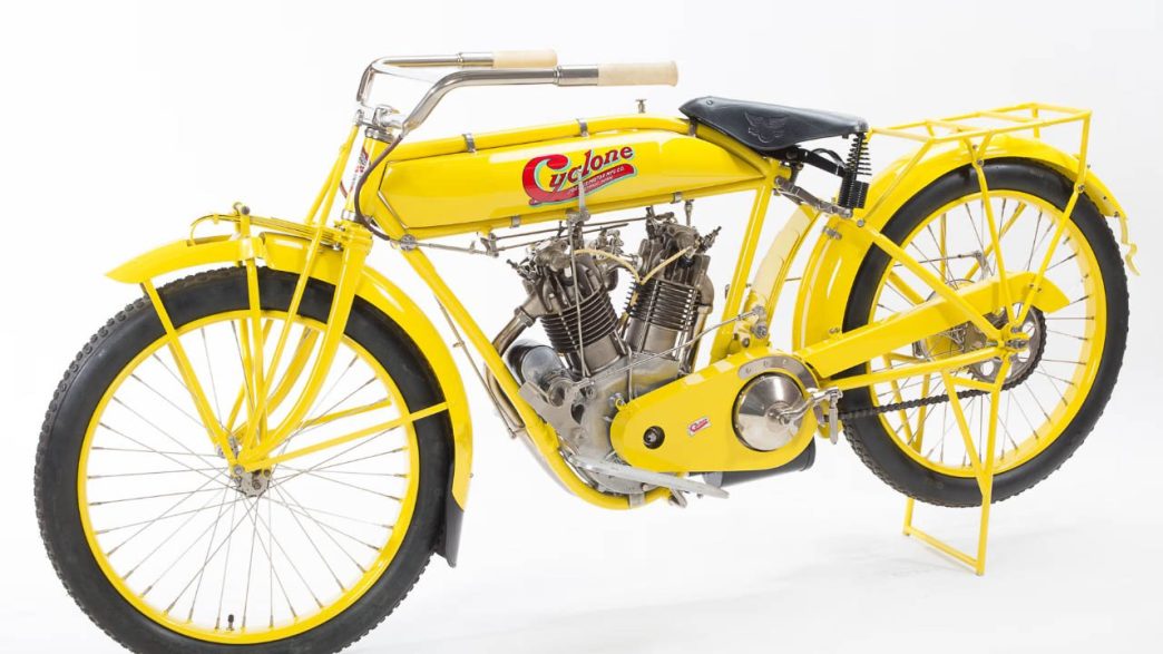 La Cyclone a été régulièrement présente sur les circuits de course sur planche jusqu’en 1917. À cette époque, d’autres fabricants de motos ont commencé à proposer des versions moins chères, forçant Joerns à vendre le modèle à Ignaz Schwinn de l’Excelsior Motor Company, qui a ensuite développé de nombreuses machines inspirées de ce deux-roues légendaire. La production de la Cyclone a officiellement cessé en 1920. À ce jour, très peu d’exemplaires ont survécu aux ravages du temps : seulement 14 motos existent actuellement, dont cinq sont de pures versions de course. Cela souligne l’exclusivité de cette moto classique !