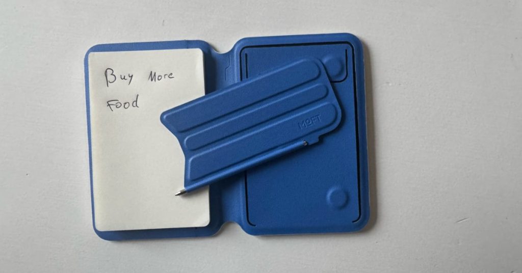 Le MOFT Action Inspiration est un accessoire MagSafe innovant conçu pour ceux qui aiment utiliser des notes adhésives et ont besoin d’un outil pratique à emporter. Le produit comprend un portefeuille, un support, un très petit stylo et un bloc-notes.
