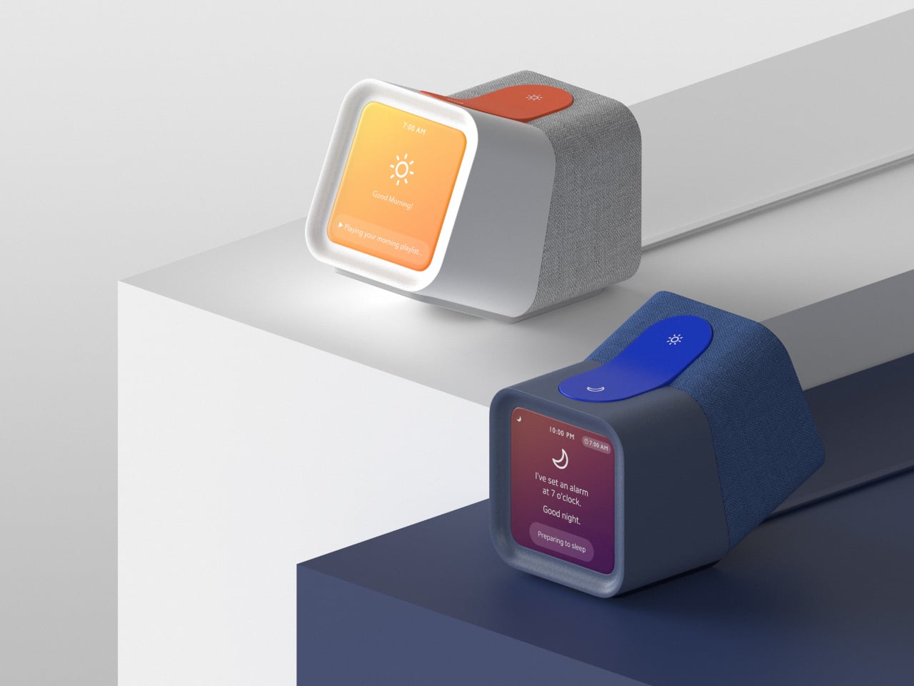 Le Tilt This Smart Clock est un réveil innovant qui fonctionne également comme un interrupteur d’ambiance IoT. Sa forme est un petit objet en coin, doté d’un écran carré d’un côté et recouvert de tissu sur le reste de sa surface. Au lieu de naviguer dans des menus, il suffit de l’incliner comme un bascule pour changer entre le mode jour et le mode nuit. L’écran s’adapte à la position, affichant un soleil lumineux ou une lune obscure selon l’orientation.