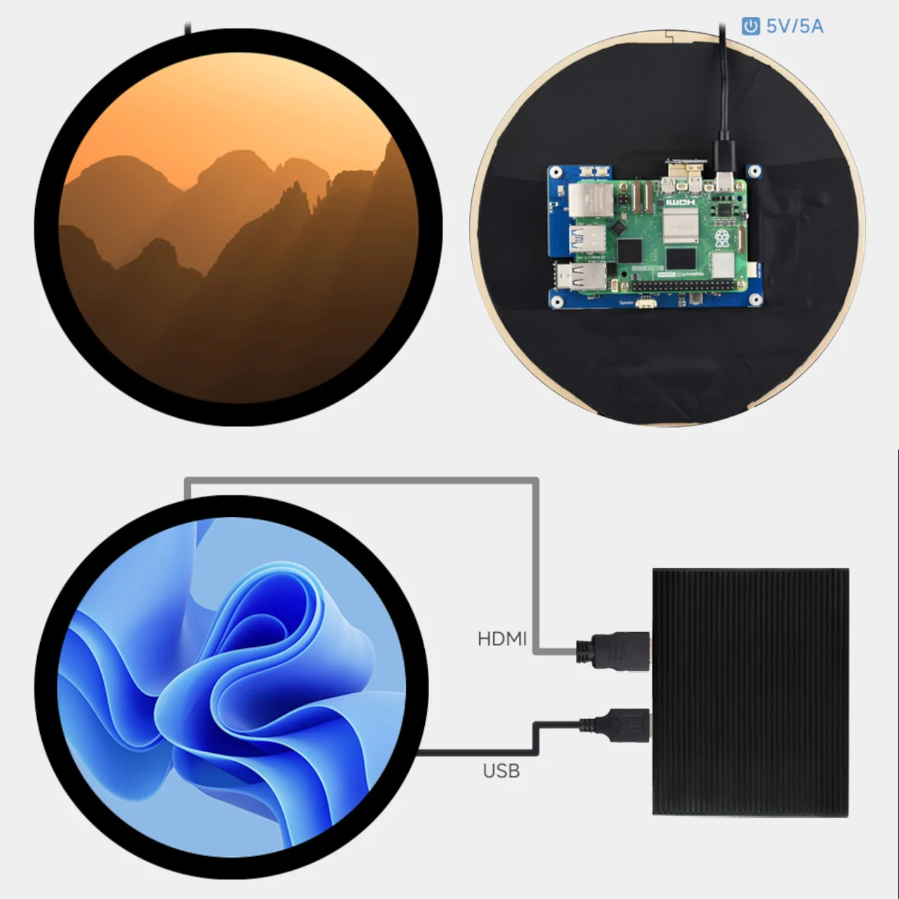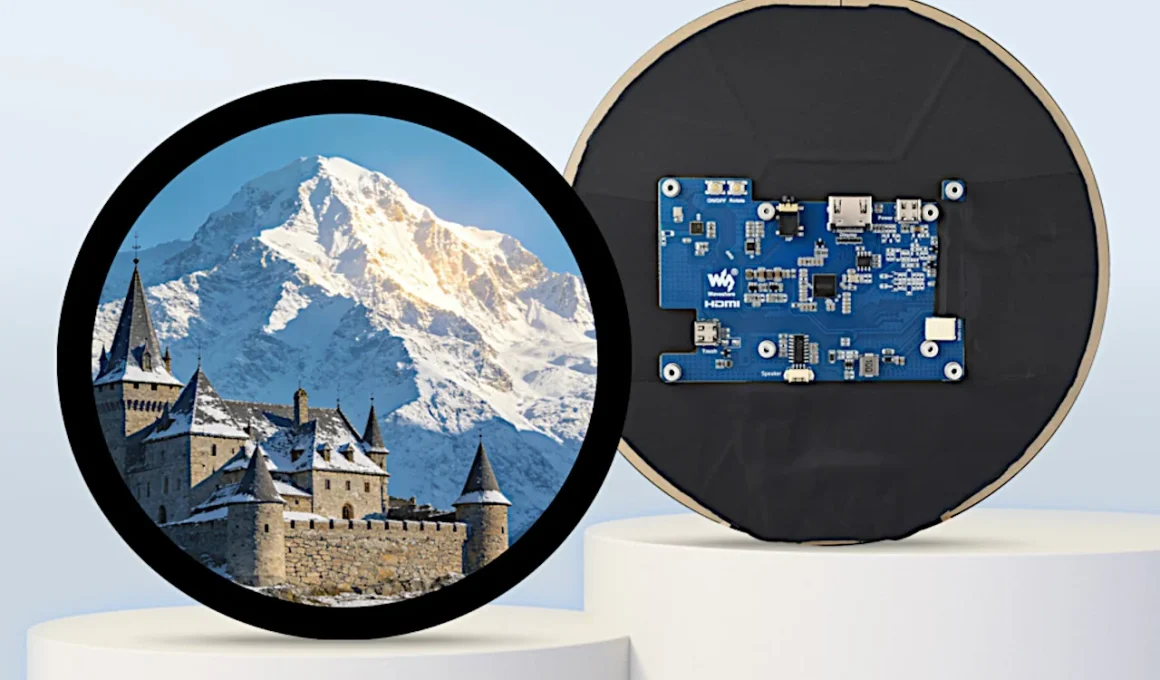 C’est ici qu’intervient le 7-inch round touch display de Waveshare. Cet écran tactile circulaire de 1080×1080 pixels est conçu pour allevier ce problème. Il offre un affichage IPS avec une capacité tactile à 10 points, un verre renforcé ainsi qu’un assemblage optique. La connexion se fait simplement via un câble HDMI pour la vidéo et un câble USB-C pour les données tactiles.