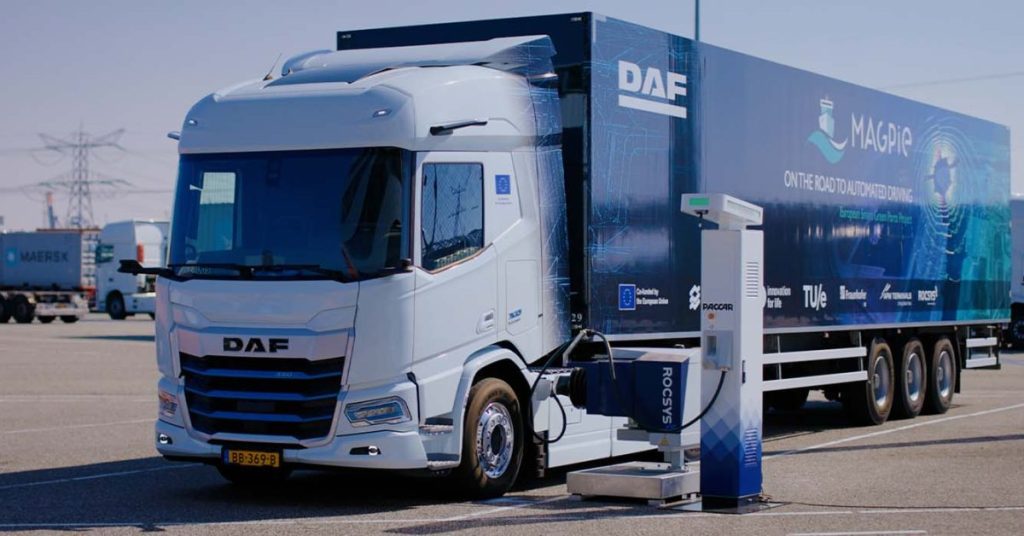 La démonstration a eu lieu à APM Terminals Maasvlakte II dans le port de Rotterdam. Un camion électrique DAF a conduit de manière autonome, avec un conducteur à bord, avant de se diriger vers un chargeur de Rocsys pour une recharge automatisée.