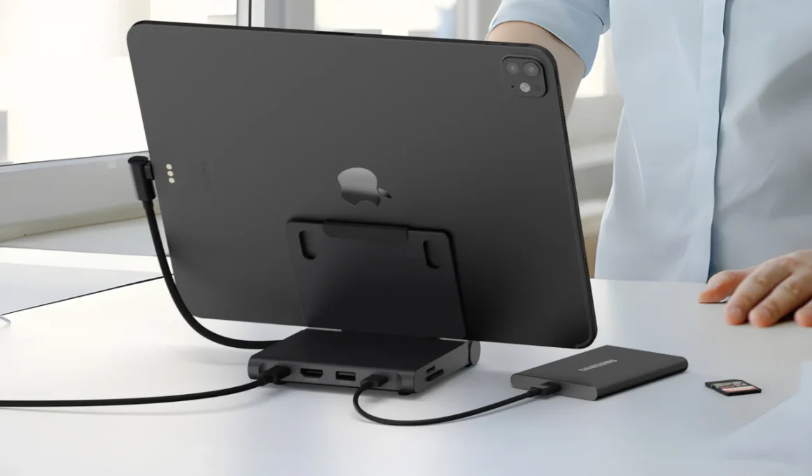 Le principe de cet accessoire est simple : il suffit de déplier le stand et de connecter le câble USB-C de 17 cm à une tablette ou un ordinateur portable. Dès lors, l’intégralité des ports devient opérationnelle : une sortie HDMI 2.0 capable d’atteindre le 4K à 60 Hz, deux ports de données à 10 Gbps (un USB-C et un USB-A), des emplacements pour cartes SD et microSD UHS-II à des vitesses allant jusqu’à 312 Mo/s, une prise audio 3,5 mm, et un transfert d’alimentation USB-C Power Delivery de 100W. Cette dernière fonctionnalité permet de fournir jusqu’à 85W à l’appareil hôte, suffisant pour alimenter un MacBook Air ou un iPad Pro lors de sessions intensives sans épuiser la batterie.