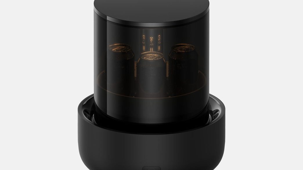 Avant de plonger dans les aspects pratiques, on pourrait confondre Come Together avec un projecteur surélevé, mais en réalité, ce que l’on perçoit comme des pistons sont en fait des canettes de boisson que l’on peut facilement stocker à l’intérieur. Ce design ressemble à une tour soutenue par une base robuste et se divise en trois parties : le plateau de la table, le réfrigérateur, et le socle du système audio. Lorsqu’on le désire, le plateau peut se rétracter pour révéler un réfrigérateur capable de stocker jusqu’à cinq canettes. Ce plateau multifonction peut également faire office de station de charge sans fil Qi2.