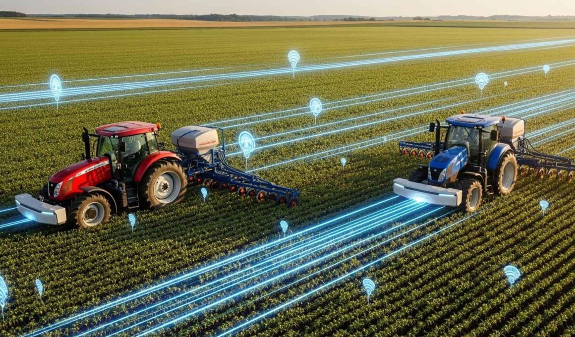 Un exemple serait des moissonneuses et des tracteurs autonomes qui se coordonnent entre eux sur de grandes étendues : tandis qu’une machine récolte la culture, une autre collecte le produit et le transporte, tout cela synchronisé pour réduire les temps d’attente et optimiser la consommation de combustible.