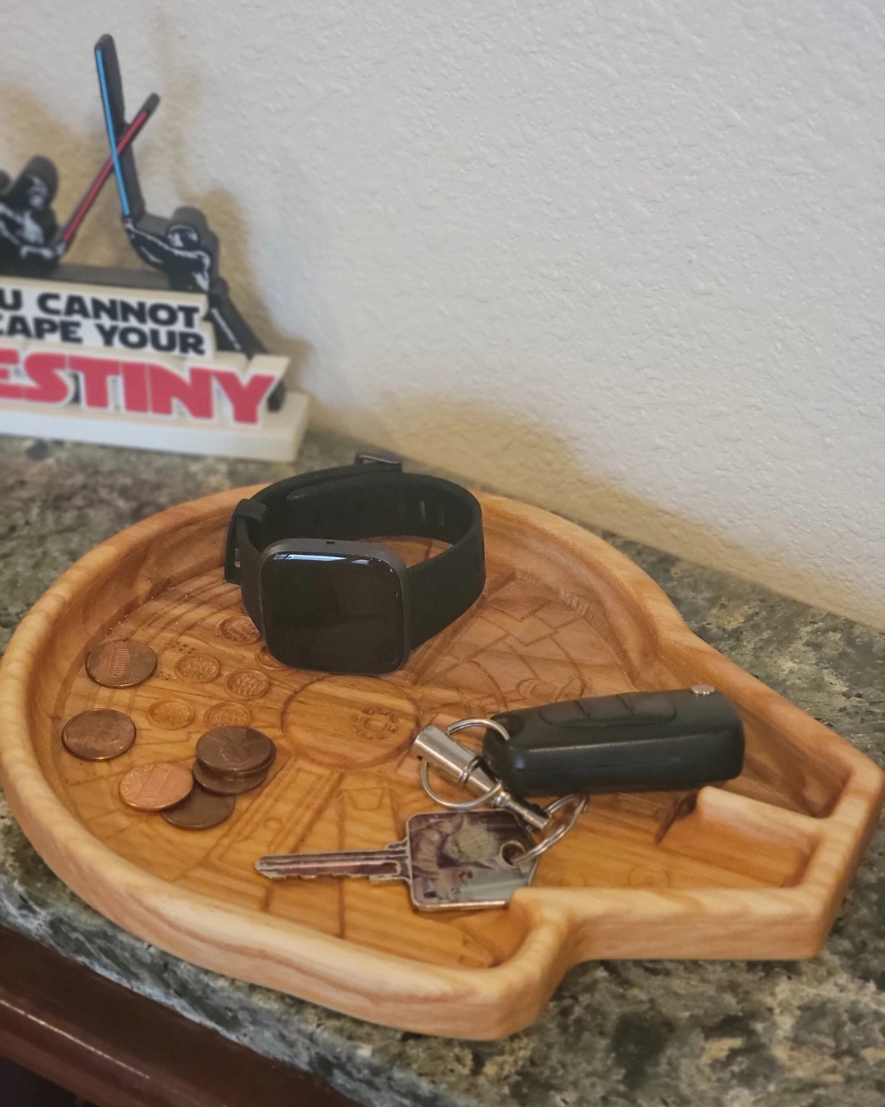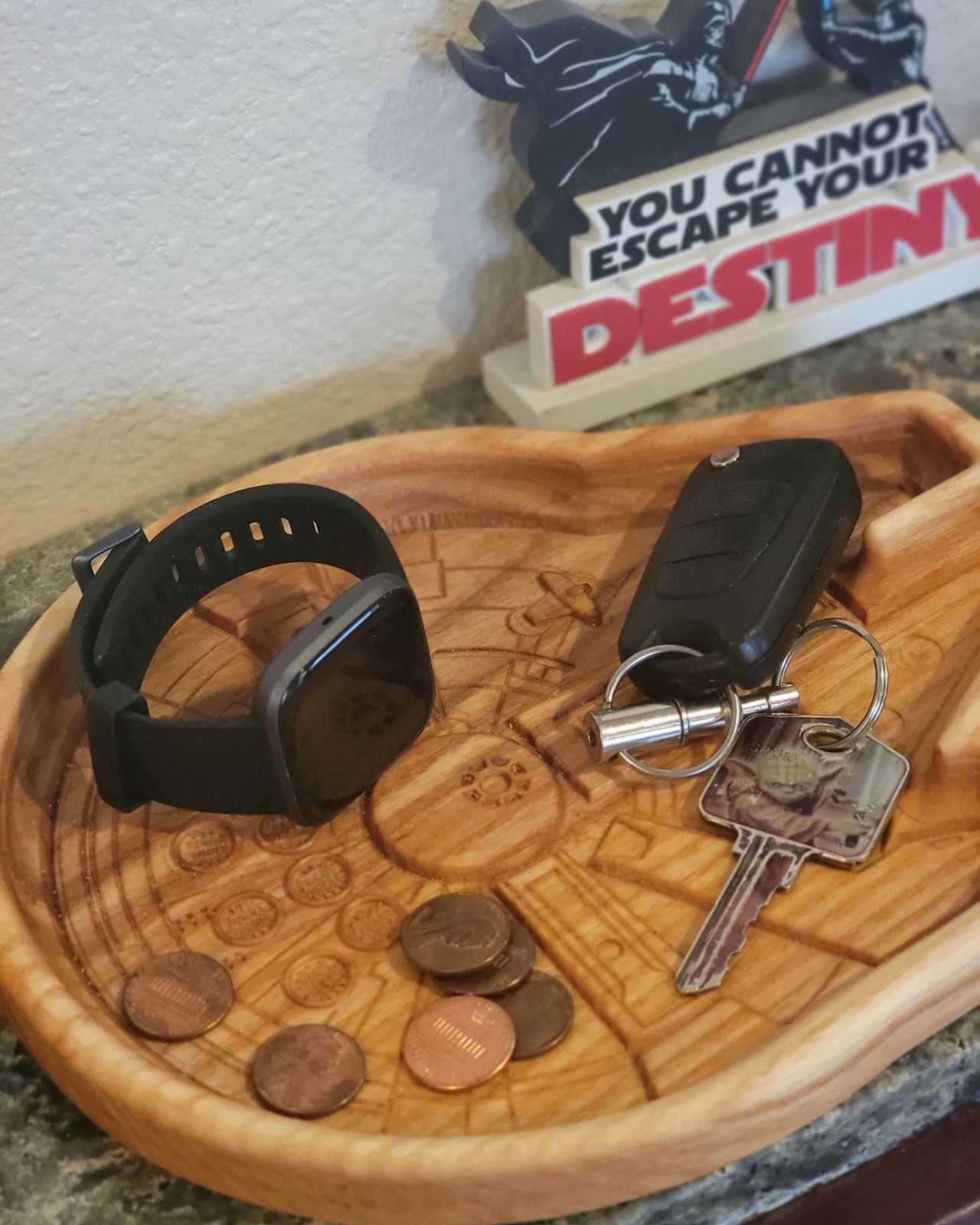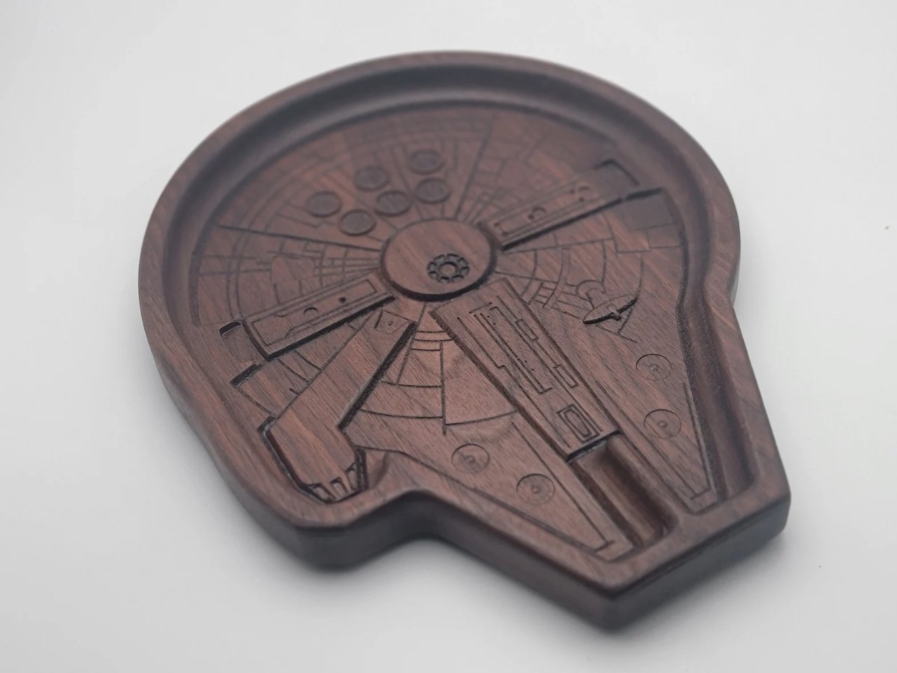 Le plateau valet Millennium Falcon est un accessoire en bois fait main qui sert de rangement pour vos clés, portefeuille, lunettes de soleil et autres objets du quotidien. Sa conception unique évoque le célèbre vaisseau spatial de Star Wars, alliant fonctionnalité et esthétique geek.