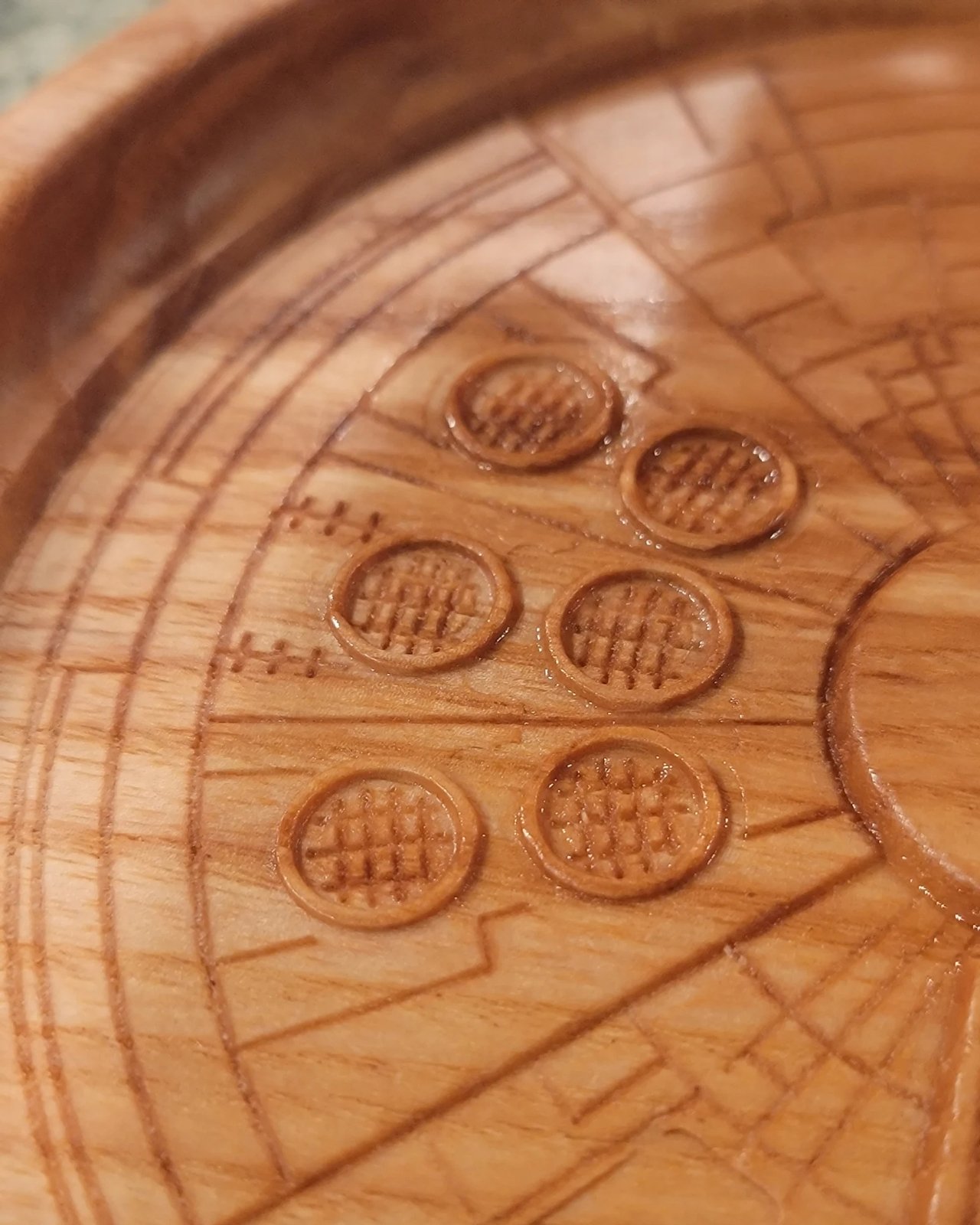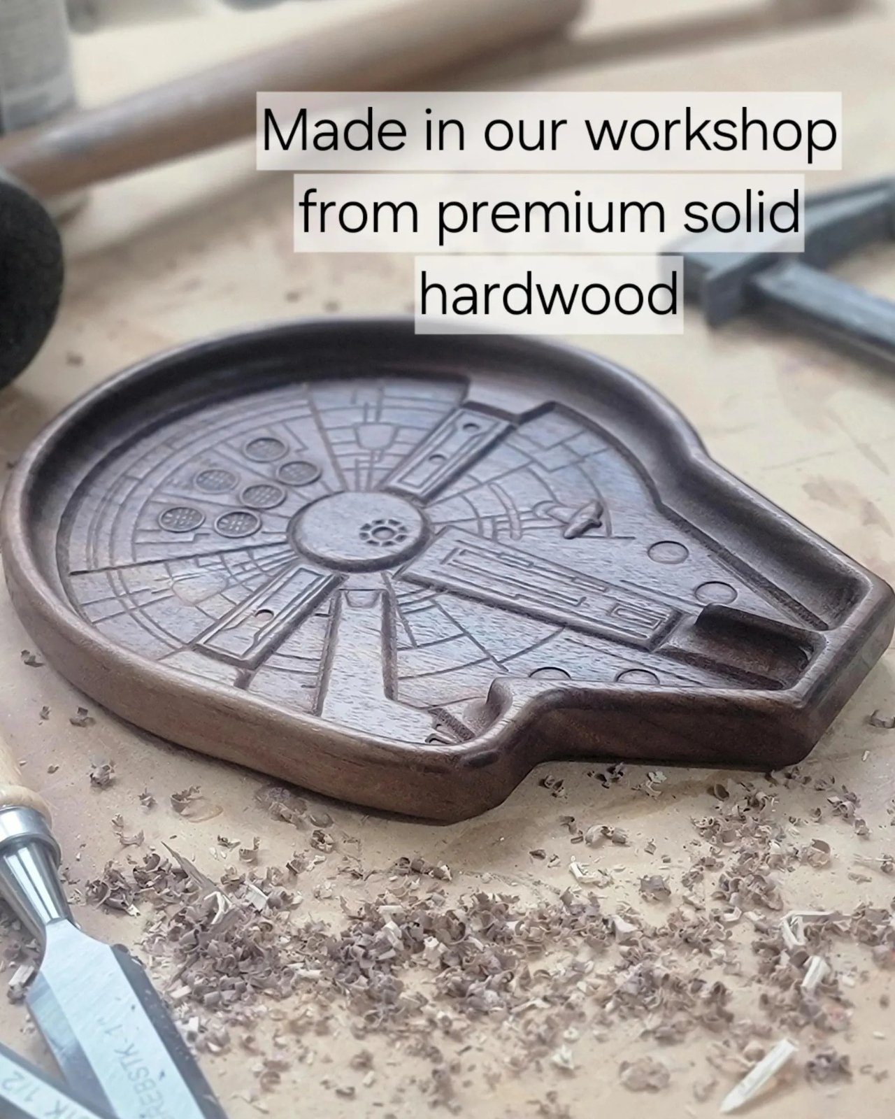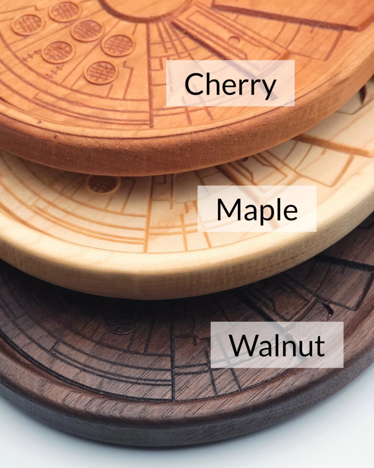 Ces plateaux sont fabriqués à partir de bois massif comme le cerisier, le noyer ou le chêne. Chaque pièce est unique en raison des variations naturelles du bois, et certaines sont même décorées avec des détails brulés pour imiter les panneaux du Millennium Falcon.