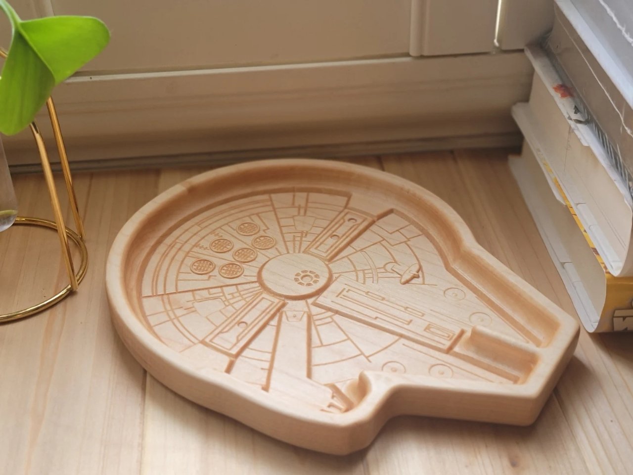 Vous vous demandez sûrement ce qu’est un plateau valet du Millennium Falcon. Imaginez un accessoire en bois fait main qui apporte une touche unique à votre entrée ou à votre table de nuit. Ce n’est pas un simple plat où les objets se perdent. C’est le vaisseau spatial le plus rapide de la galaxie, réinventé pour être le rangement idéal de vos clés, portefeuille, lunettes de soleil, et bien plus encore.
