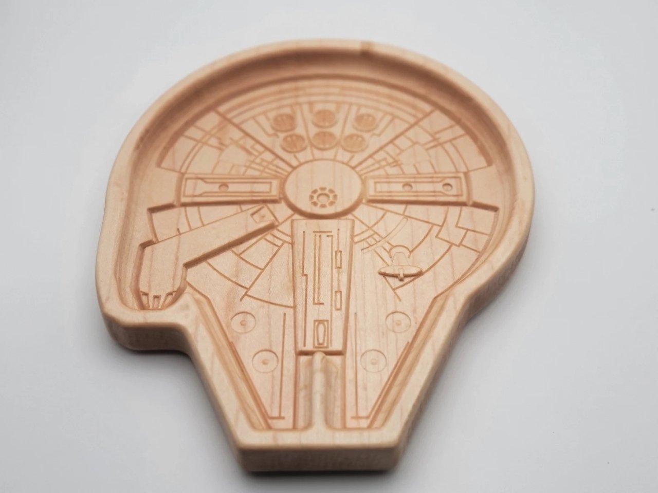 Fabriqués à partir de bois massif comme le cerisier, le noyer ou le chêne, ces plateaux reflètent parfaitement la silhouette emblématique du Millennium Falcon. Le grain naturel du bois donne à chaque pièce un caractère unique, garantissant que aucun plateau ne se ressemble. Certains artisans ajoutent même des détails brûlés au bois, ajoutant des panneaux et des ports qui rendent le Millennium Falcon reconnaissable des kilomètres à la ronde.