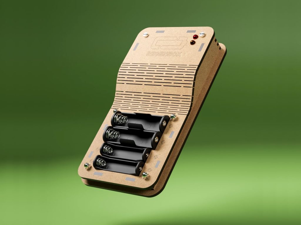 RegenBox 1 est un kit permettant de régénérer des piles alcalines AA et AAA, conçu pour les hobbyistes en électronique. Il se compose d’une carte de circuit imprimé, de pièces électroniques et de panneaux en bois découpés au laser.