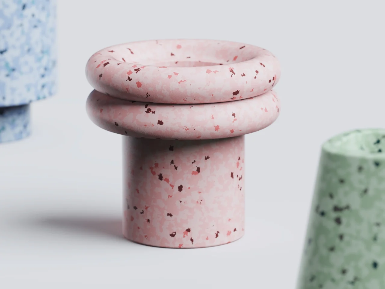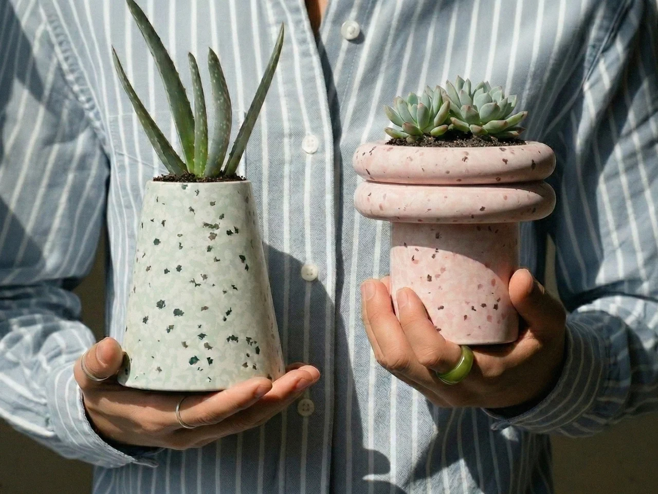 Ce qui sort de la machine est véritablement surprenant. Les pots présentent une texture semblable à du terrazzo grâce aux fibres mélangées, et se déclinent en teintes douces de bleu, rose et vert, selon les matériaux utilisés. Cette apparence est essentielle : si le résultat était banal ou utilitaire, l’impact émotionnel serait compromis. À la place, vous obtenez un objet qui conserve une trace de la pièce de vêtement d’origine, tout en supportant une plante majestueuse.