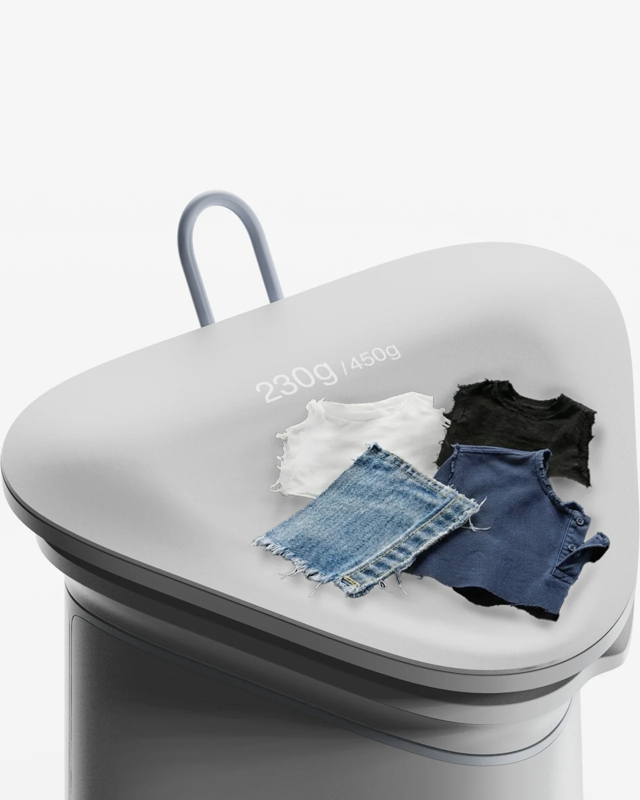 Le mécanisme de ByBye est à la fois simple et astucieusement conçu. Vous introduisez les vêtements par une ouverture en haut, qui ajuste l’entrée grâce à un rail coulissant. Une fois le poids désigné atteint, l’ouverture se ferme automatiquement. À l’intérieur, un broyeur réduit le tissu en particules fines. Celles-ci sont ensuite versées dans un moule pour pots de fleurs, compressées par une plaque de pression et durcies par un traitement à haute température. Environ dix minutes suffisent pour produire un pot, avec une application qui suit le poids du tissu, le nombre de pots créés, et le temps total de production.