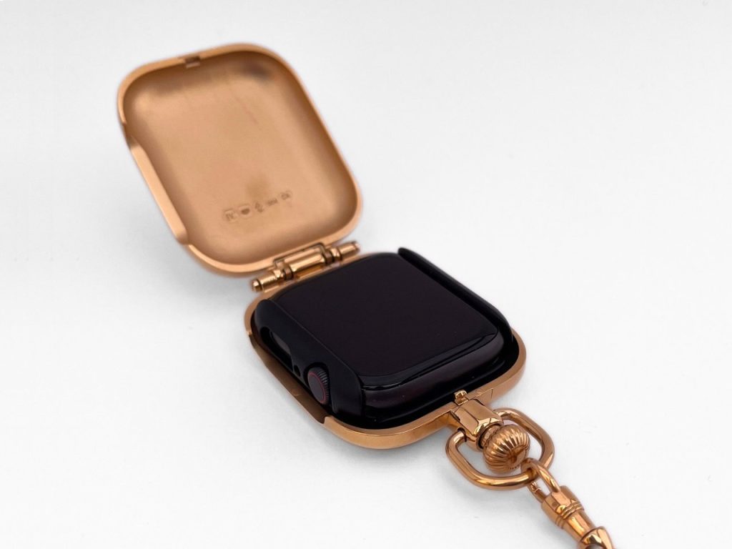 Cet accessoire révolutionnaire transforme votre Apple Watch en une montre de poche sophistiquée. Il allie ainsi la technologie moderne d’Apple à l’esthétique raffinée de l’horlogerie vintage. Le boîtier en acier inoxydable brillant, orné de gravures délicates et doté d’une chaîne détachable, apporte une note de charme d’antan à un appareil issu de l’innovation de la Silicon Valley.