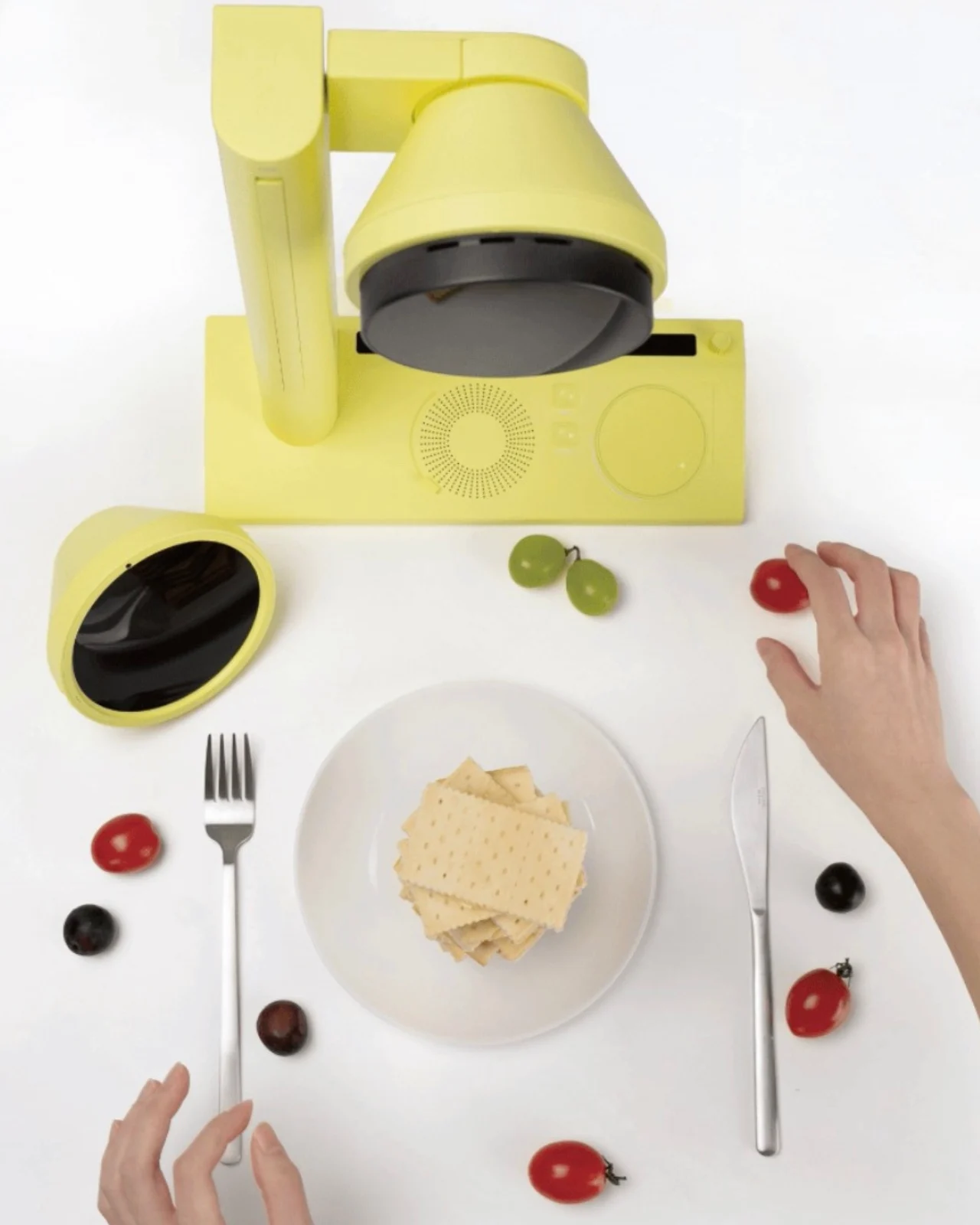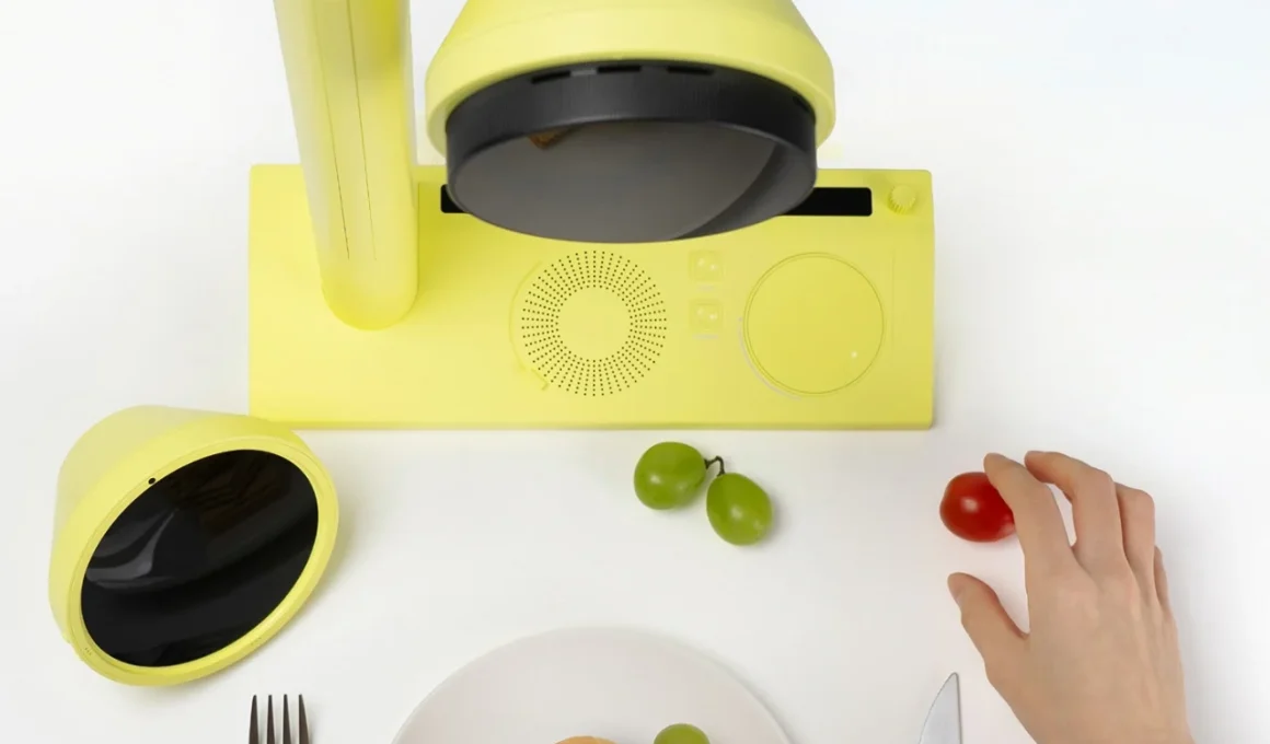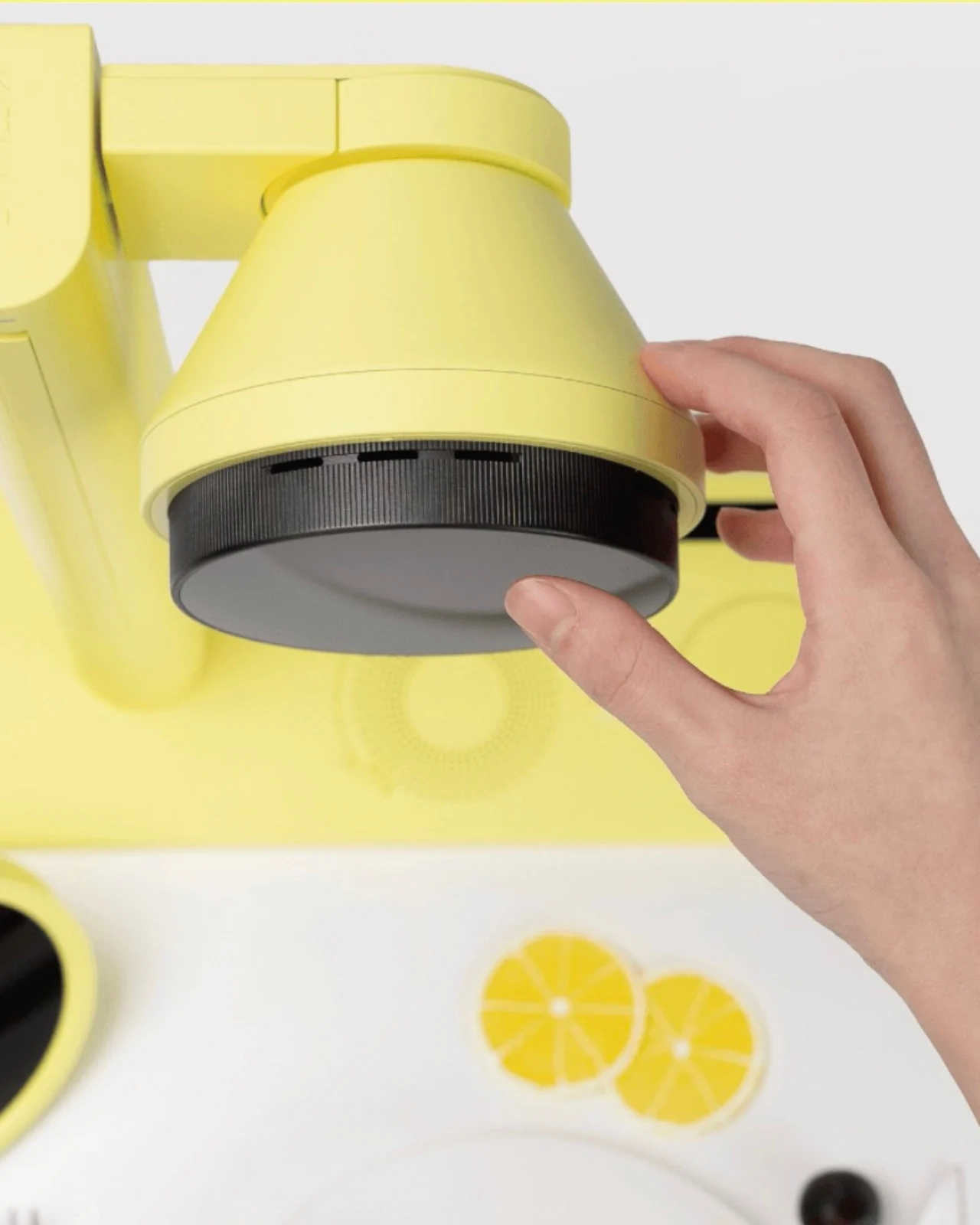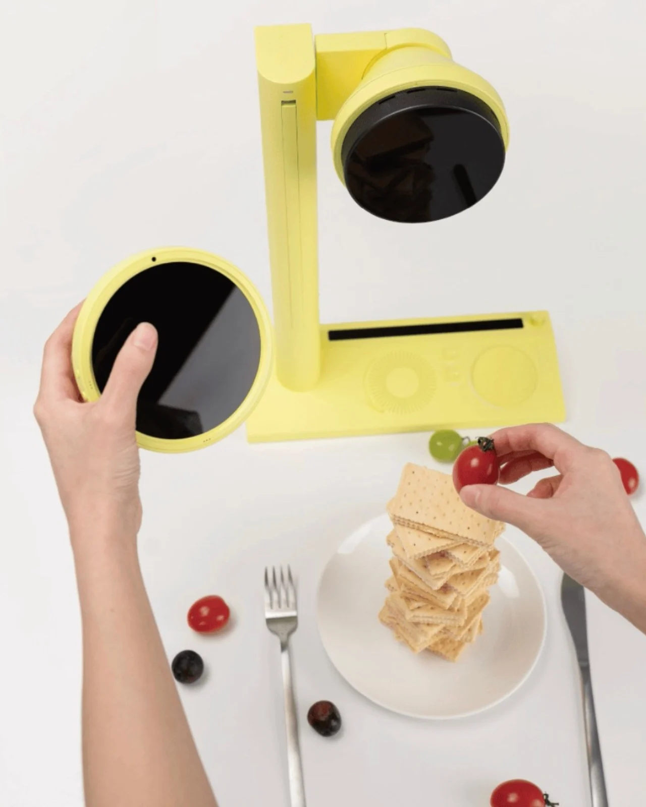 Le design matériel de Kitune est particulièrement réfléchi. Il est conçu comme un appareil portable pouvant fonctionner de deux manières : dans une configuration portative pour un travail de près et une version sur pied où un bras suspend le projecteur au-dessus de votre assiette. Les deux modes affichent une finition jaune joyeuse, un choix de couleur qui adoucit ce qui pourrait facilement être perçu comme une technologie froide et clinique. Ce détail indique que cet appareil fait partie de l’expérience culinaire, et non seulement des logistiques de cette dernière.