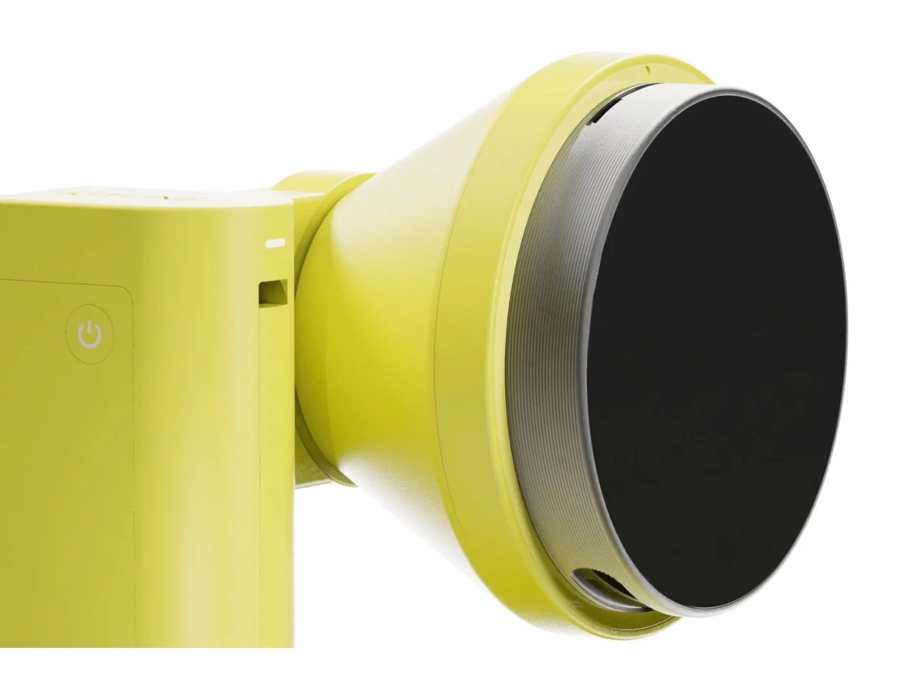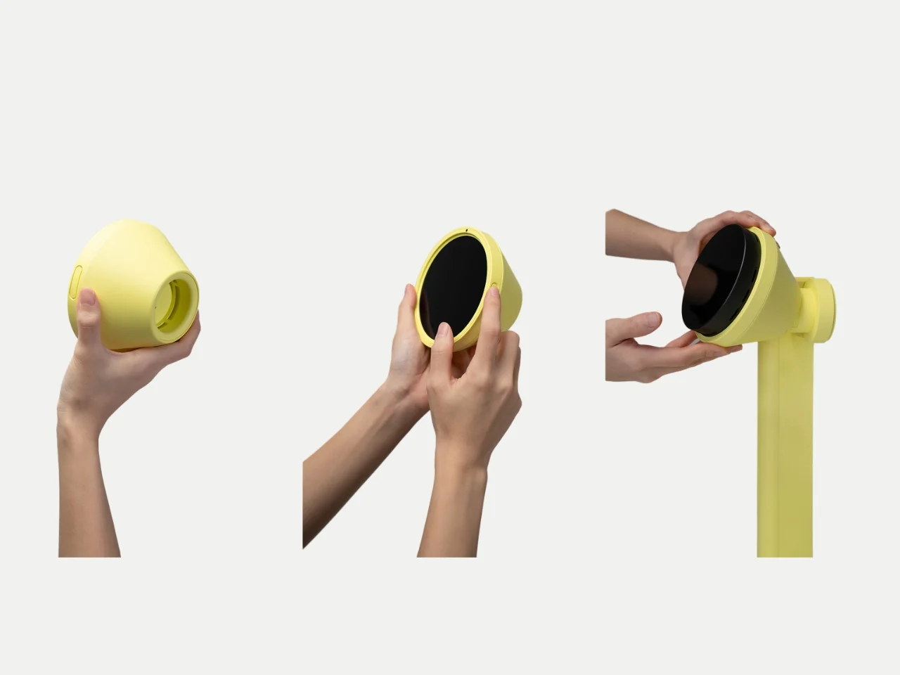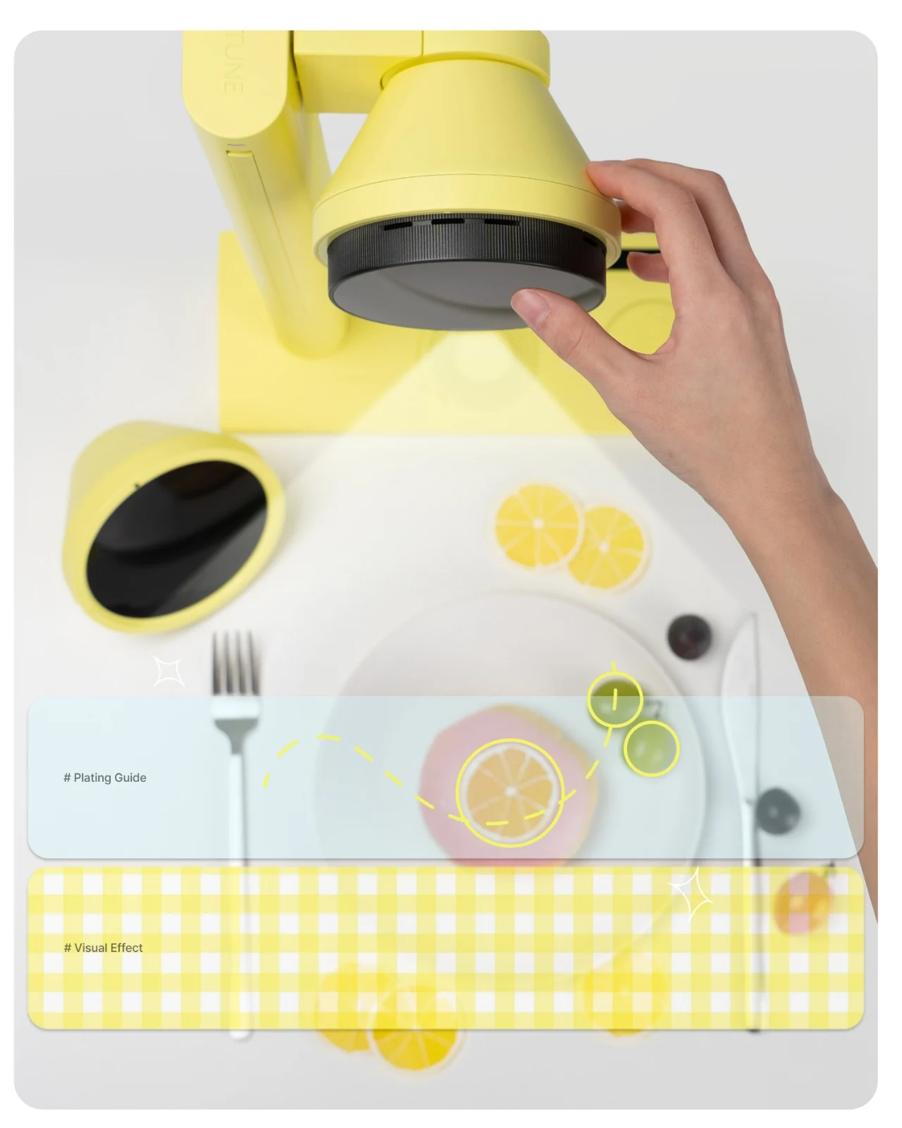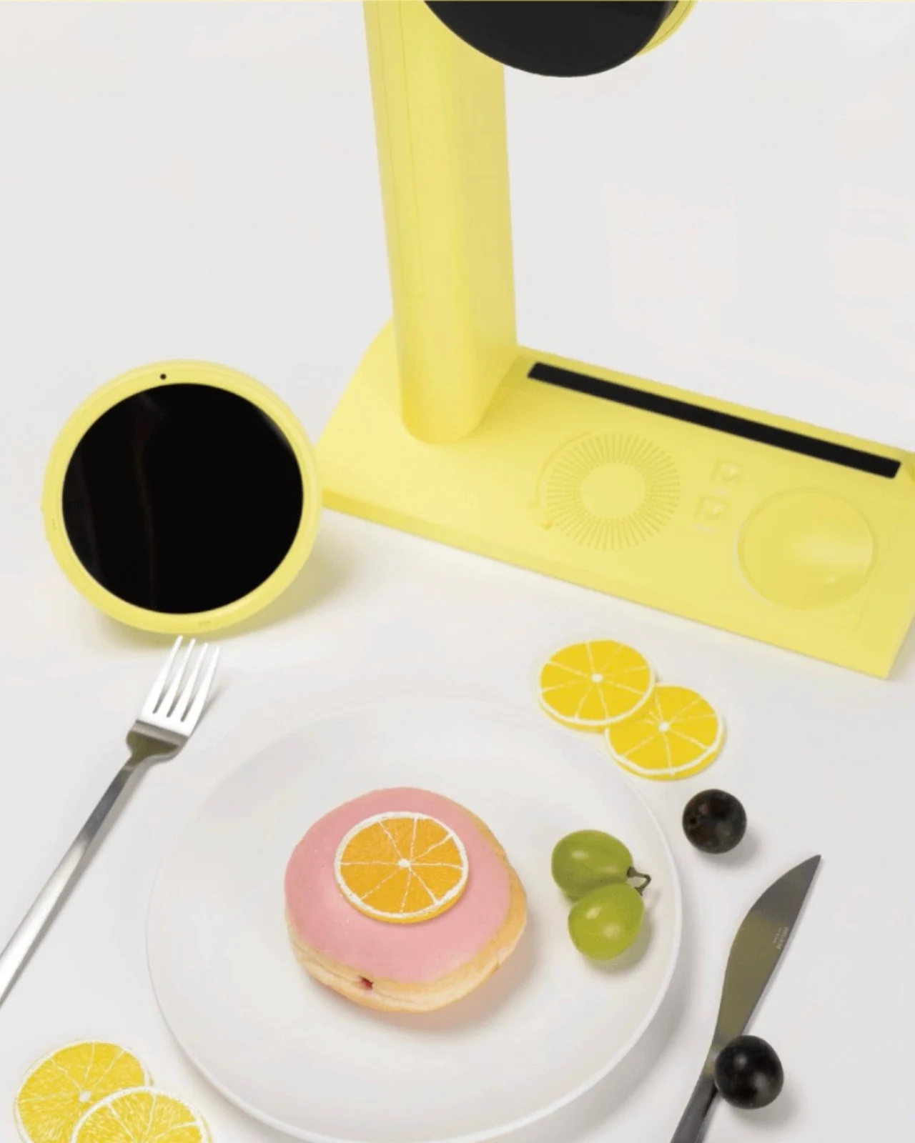 Le design matériel de Kitune est particulièrement réfléchi. Il est conçu comme un appareil portable pouvant fonctionner de deux manières : dans une configuration portative pour un travail de près et une version sur pied où un bras suspend le projecteur au-dessus de votre assiette. Les deux modes affichent une finition jaune joyeuse, un choix de couleur qui adoucit ce qui pourrait facilement être perçu comme une technologie froide et clinique. Ce détail indique que cet appareil fait partie de l’expérience culinaire, et non seulement des logistiques de cette dernière.