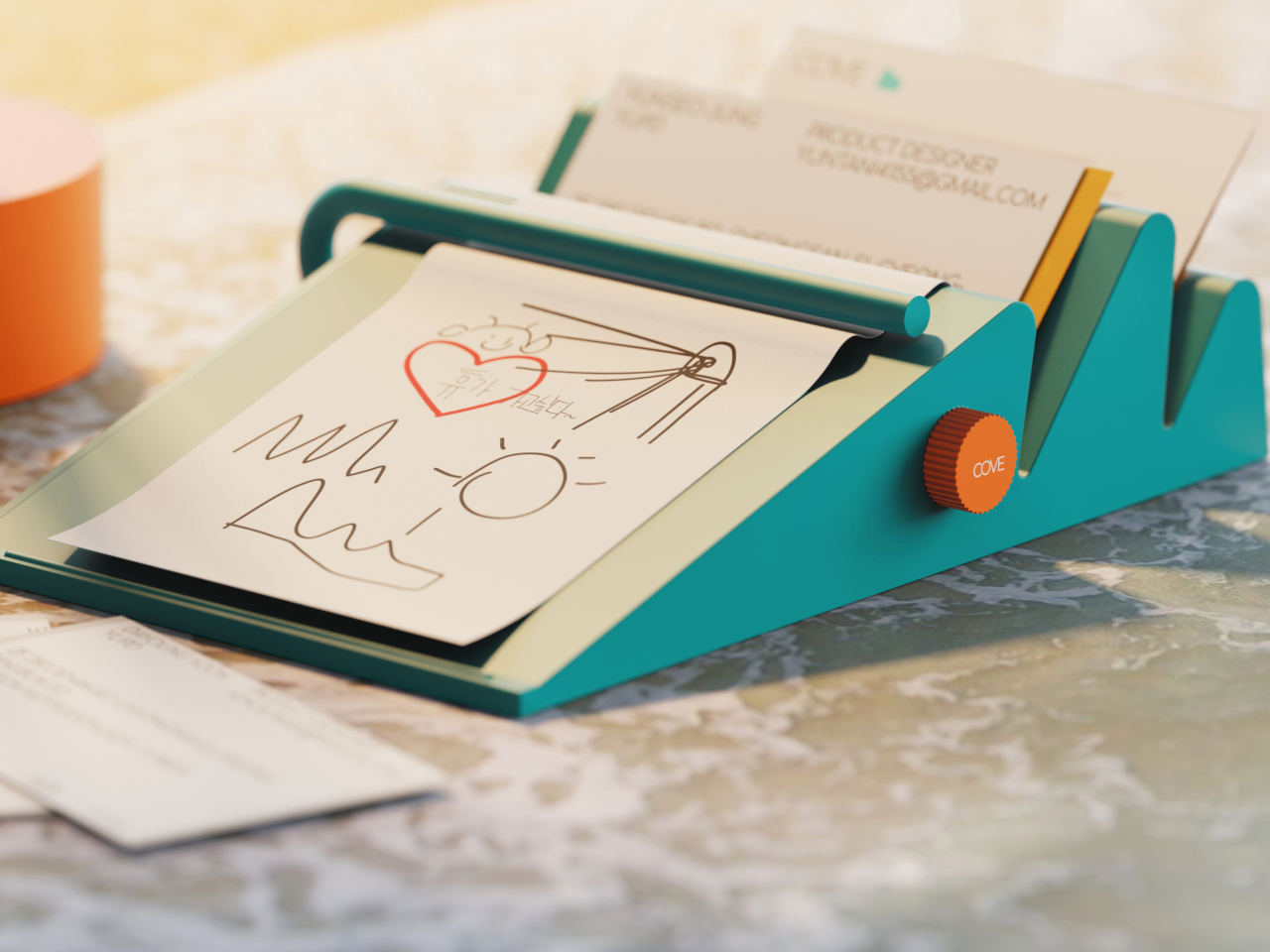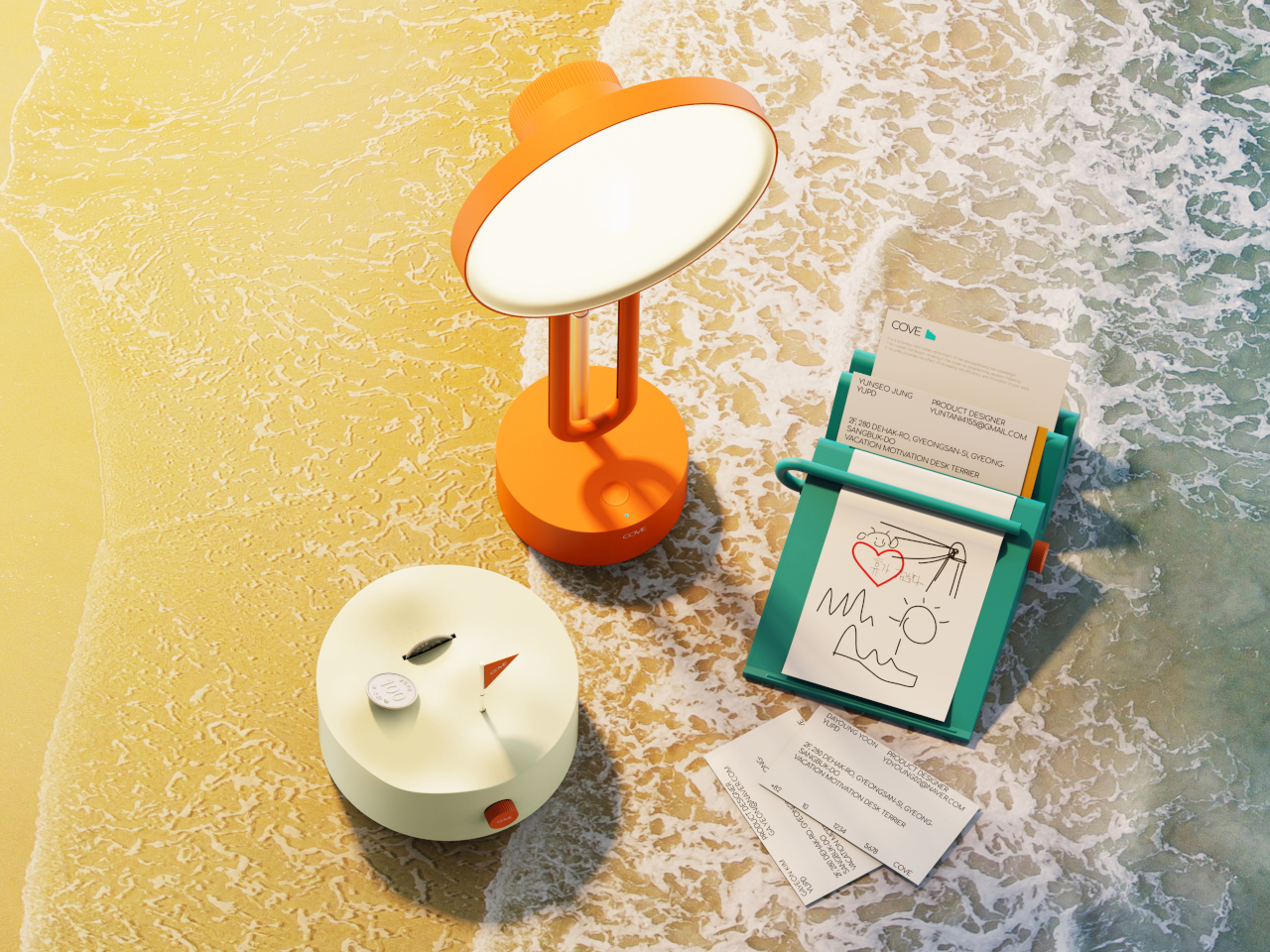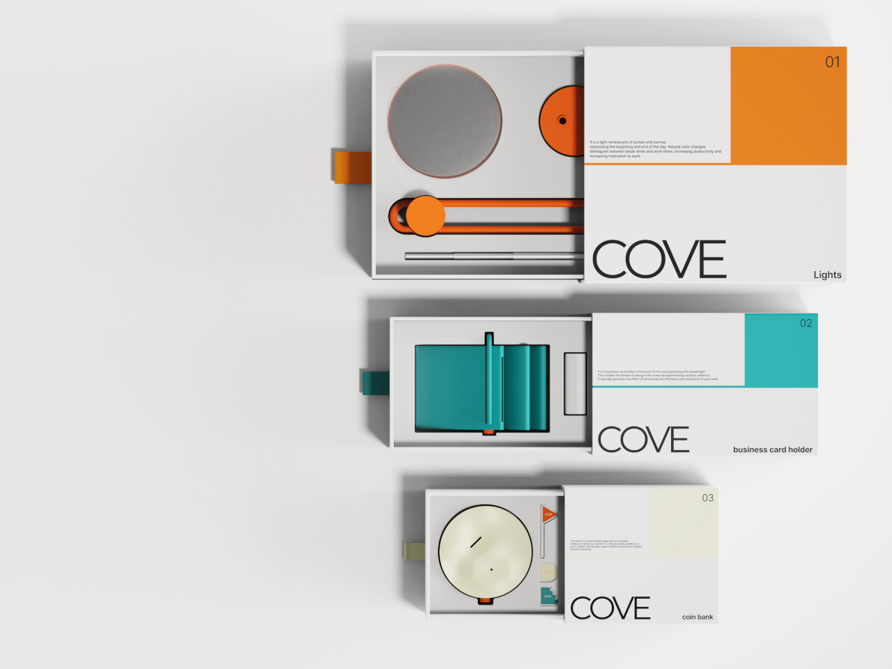 La collection Cove est un ensemble de bureau conçu pour apporter des éléments de vacances à l’espace de travail. Elle comprend une lampe en forme de soleil levant, un porte-cartes imitant des vagues océaniques et une tirelire en forme de château de sable.
