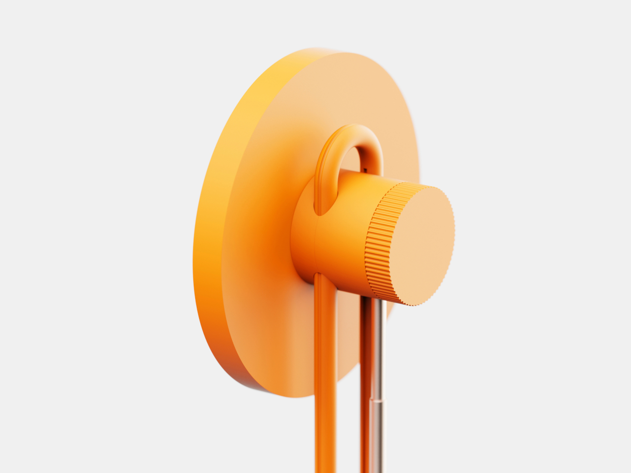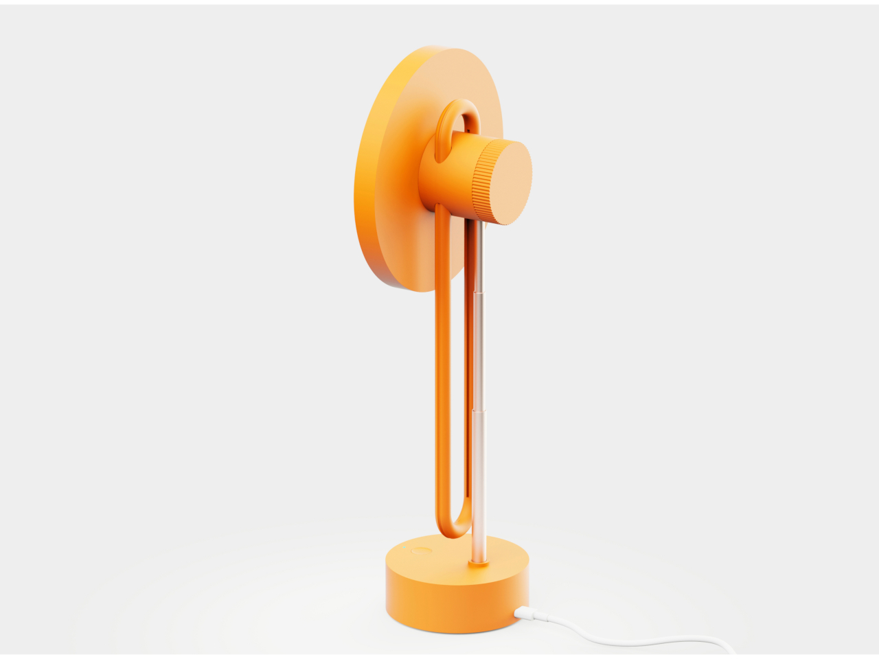 La lampe, pièce maîtresse de l’ensemble, arbore un visage circulaire lumineux soutenu par une base orange courbée. Cette tête circulaire est réglable sur l’arc, permettant aux utilisateurs d’ajuster sa position au fil de la journée. En levant la lampe le matin, cela symbolise le début de la journée de travail, tandis qu’en la baissant le soir, cela définit une frontière visuelle entre le temps professionnel et personnel. Ce geste simple se transforme ainsi en un rituel quotidien.