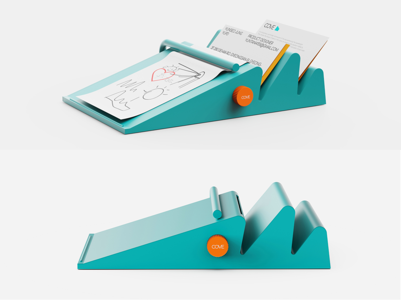 Le porte-cartes s’inspire des vagues en mouvement. Ses formes en teinte bleu-vert créent des emplacements naturels pour les cartes de visite, notes et rappels. Ce design apporte aussi un mouvement vertical à un espace souvent plat. Un clip à l’avant maintient les listes de tâches en place, et la structure en vagues permet d’organiser les objets de bureau tout en restant fidèle au thème côtier, sans être trop explicite.