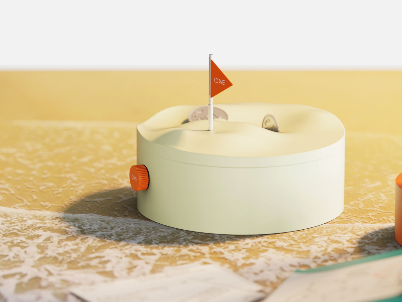 Le tirelire, quant à elle, prend la forme d’un petit château de sable avec des bords lisses et des courbes douces. Un petit drapeau au sommet peut glisser vers le haut et vers le bas pour une interaction supplémentaire. Le couvercle se retire facilement grâce à des butées en silicone situées sur la partie inférieure. Les utilisateurs peuvent y déposer leur monnaie tout au long de la semaine et y accéder au moment voulu. Les éléments tactiles incitent à interagir avec cet objet bien au-delà du simple visuel.