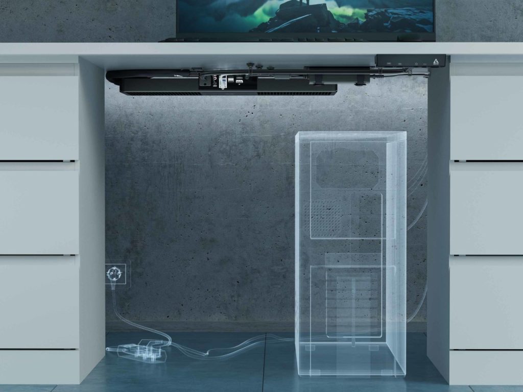 Cette dernière option est principalement envisageable si vous utilisez un mini PC, mais cela entraîne également d’autres soucis, comme l’accès limité aux ports essentiels. Il y a aussi le défi de devoir garder la petite unité à proximité pour faciliter son utilisation, ce qui peut nécessiter des modifications complexes du bureau. C’est ici qu’un design particulier, tel que le Arctic Senza, se démarque : il cache le petit PC juste en dessous du bureau et dispose d’un boîtier séparé pour les ports les plus importants.