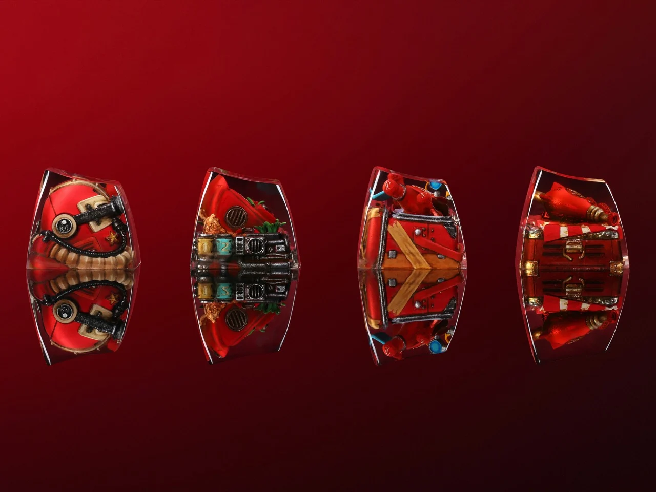 Les keycaps Fallout Nuka-Cola sont des pièces artisanales qui représentent des scènes emblématiques de l’univers Fallout, notamment un distributeur automatique, une caisse de bouteilles, un casque d’armure assistée et un Thirst Zapper. Chaque keycap est conçu pour s’adapter aux claviers et agit à la fois comme un accessoire fonctionnel et une œuvre d’art.