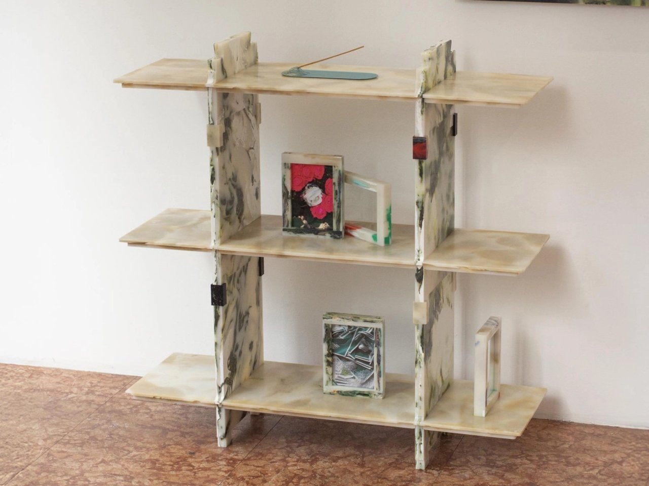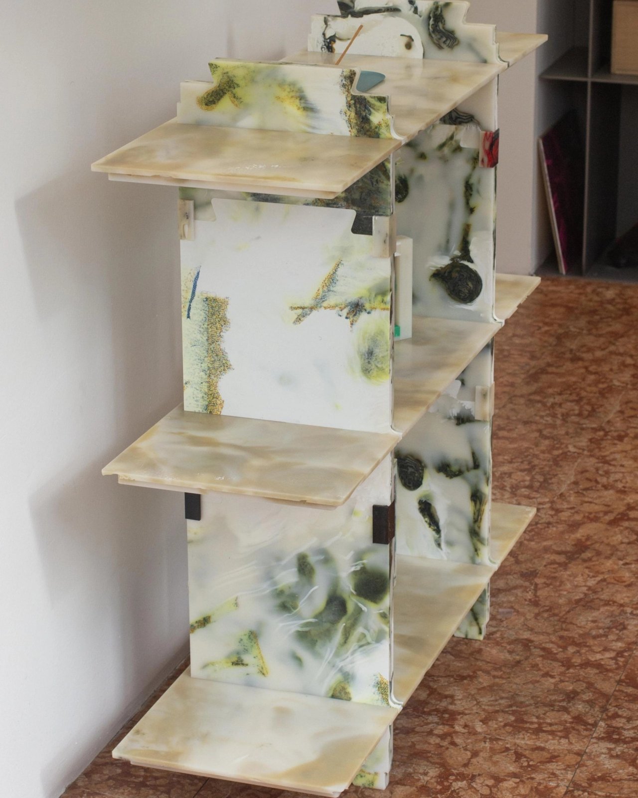 Un Étagère Modulaire en Plastique Recyclé aux Motifs Marbrés