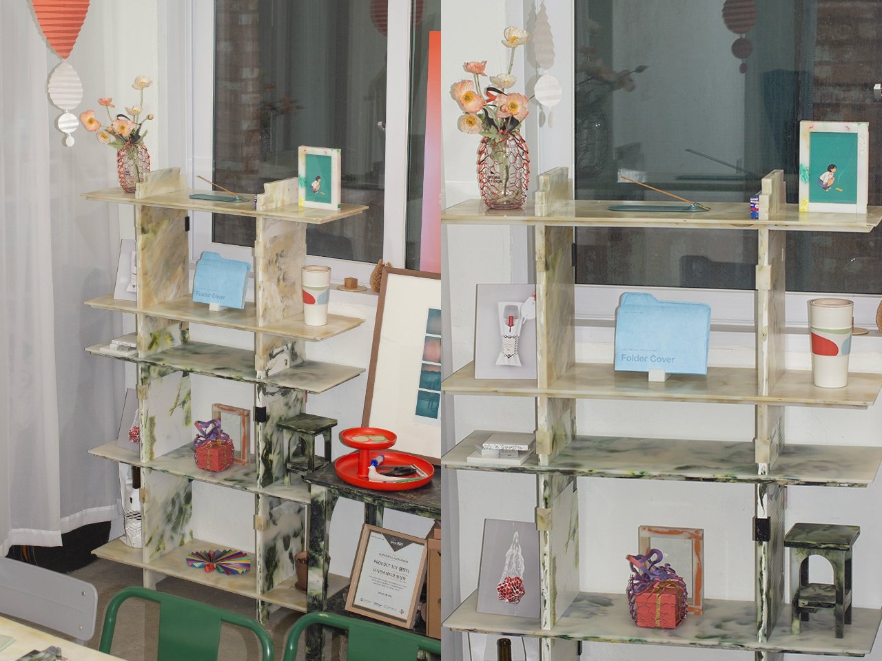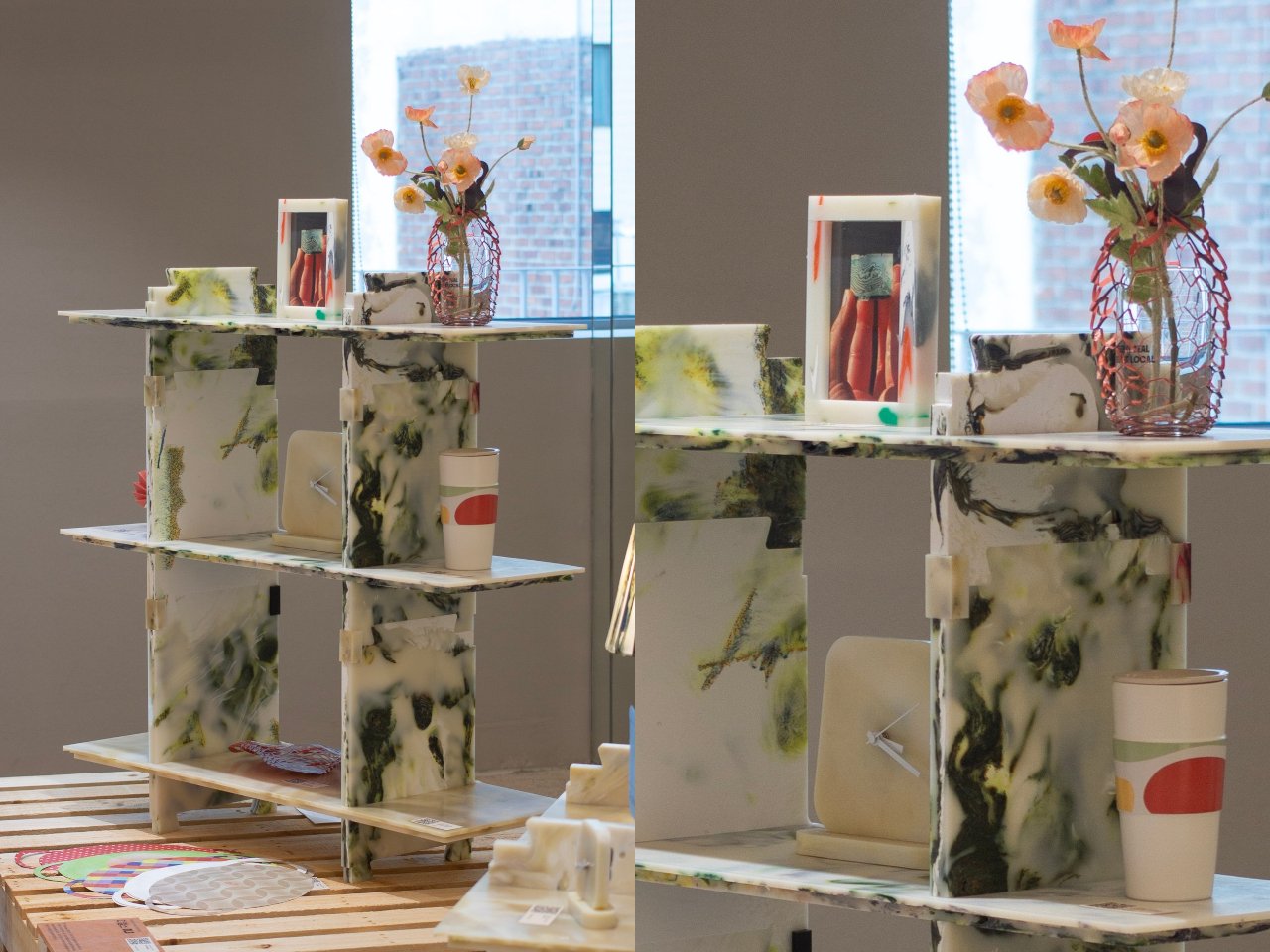 L’élément clé de cette étagère est le plastique marbré, un matériau recyclé présentant des motifs tourbillonnants et une finition brillante. Chaque panneau est visuellement unique, avec des couleurs et une transparence qui jouent avec la lumière ambiante, créant une présence sculpturale dans n’importe quelle pièce. Contrairement aux laminés imprimés ou aux revêtements en vinyle, l’effet marbré résulte directement du processus de recyclage, lui conférant ainsi un caractère d’authenticité.