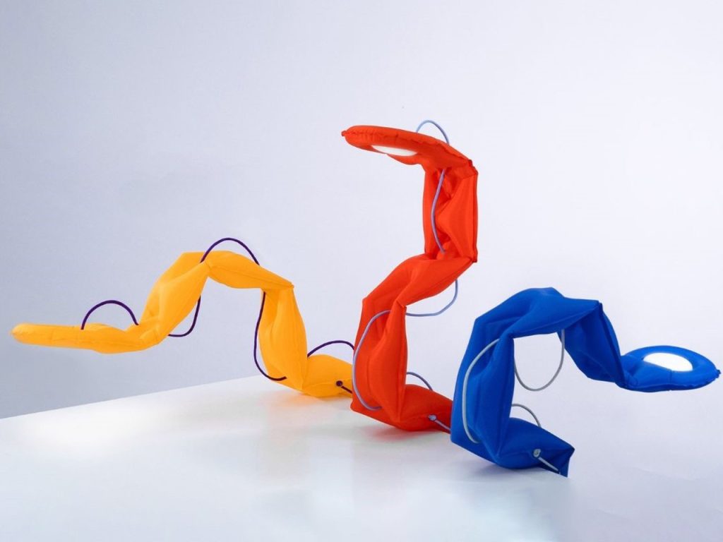 Le lampadaire SQUEEZE, conçu par Eva Ausmann, utilise l’air comme un élément central du design. Fabriqué en nylon recouvert de TPU, il maintient une pression d’air constante, ce qui lui confère légèreté et robustesse. En plus de son aspect ludique, il intègre également un capteur de pression pour contrôler l’éclairage par simple contact, créant ainsi une expérience interactive.